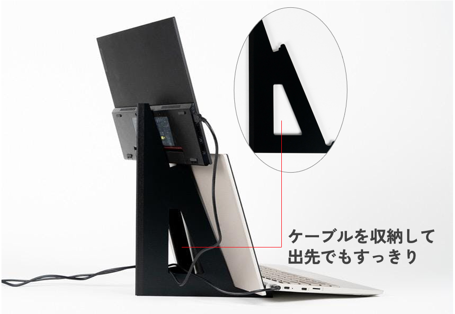 パソコンやモバイルモニターのケーブルをすっきりと収納できる穴も配置。自宅でも出先でも邪魔にならず、見た目もすっきりスマートです。