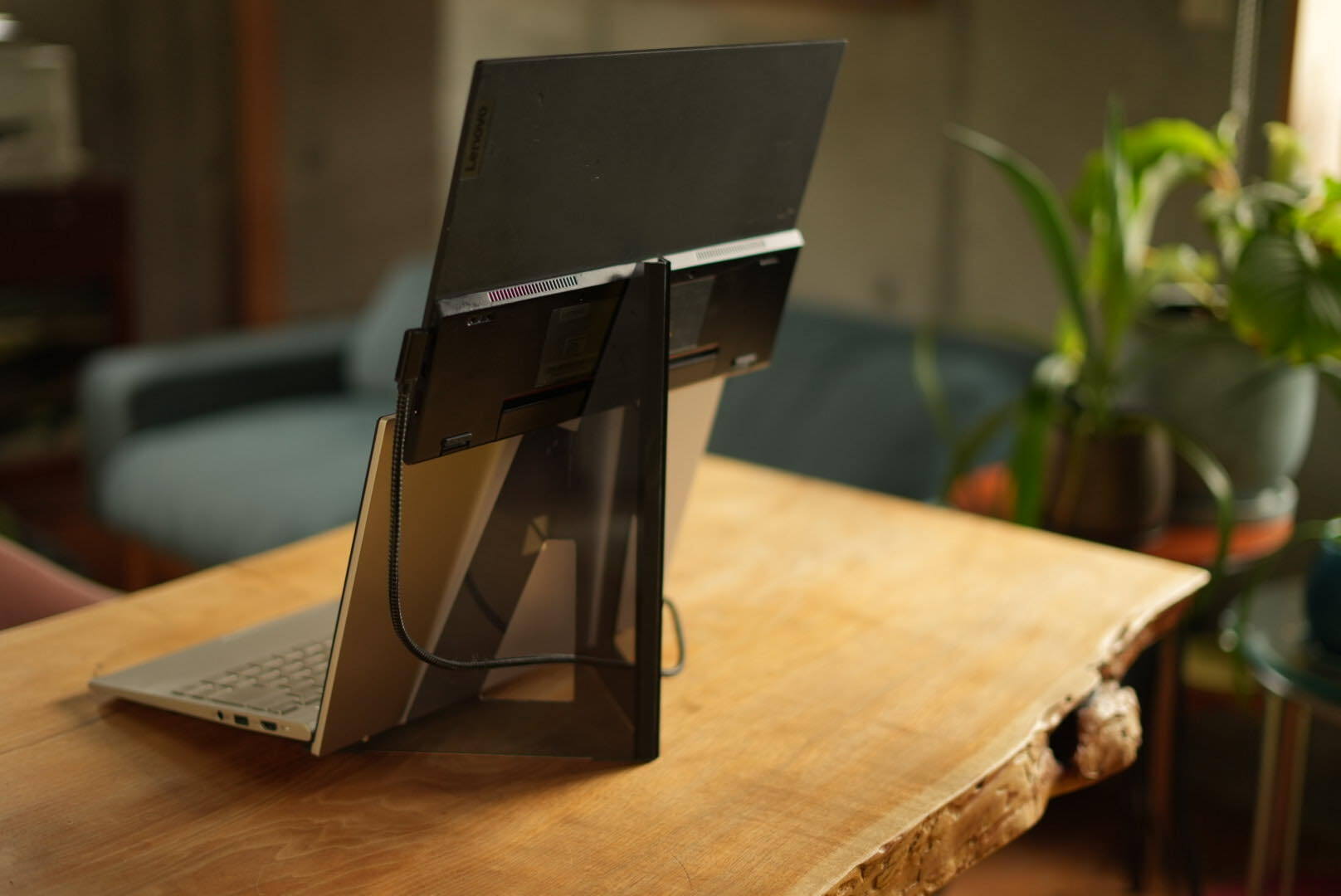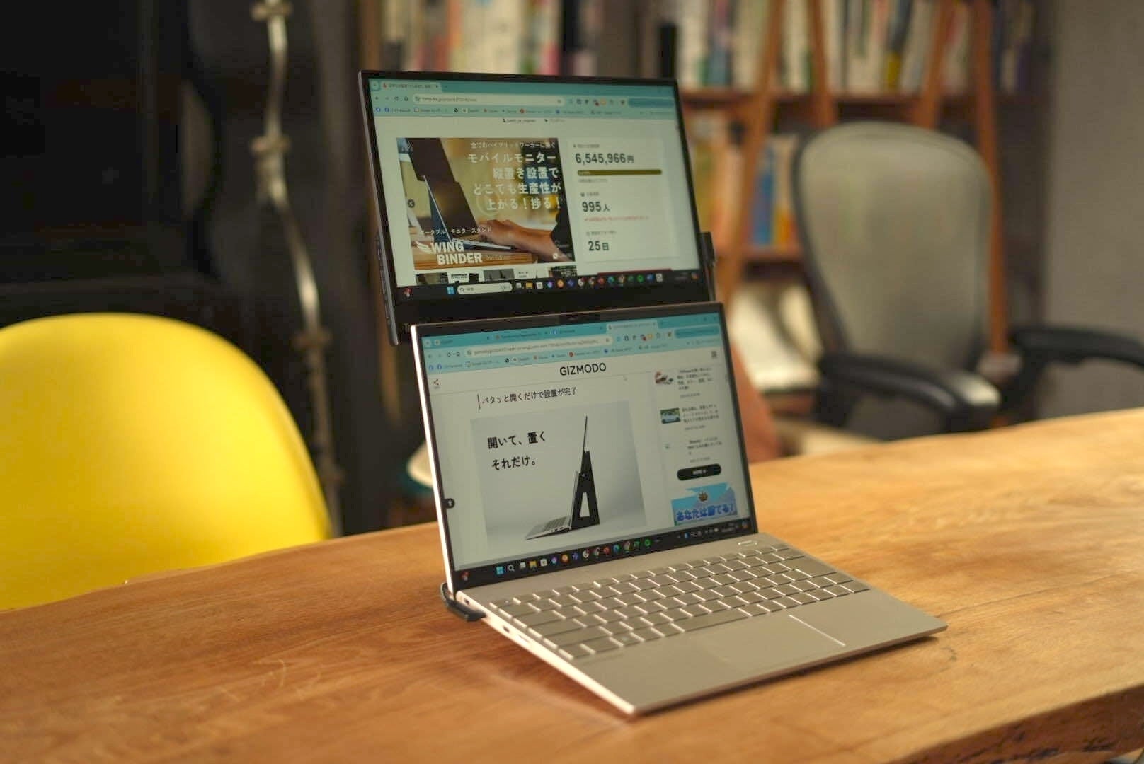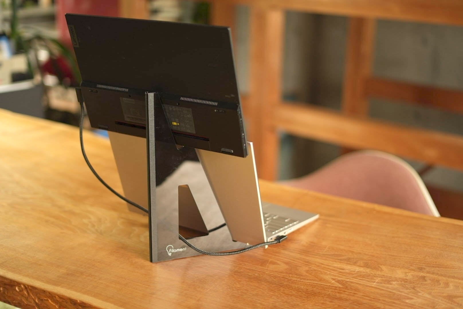 こだわったのは二点あって、ひとつ目はPCのモニターとモバイルモニターの間の隙間が極小化すること。これによって仕事への没入感が激増します。もう一つは、PC自体が「重し」となってモニターの安定感を増すという構造です。