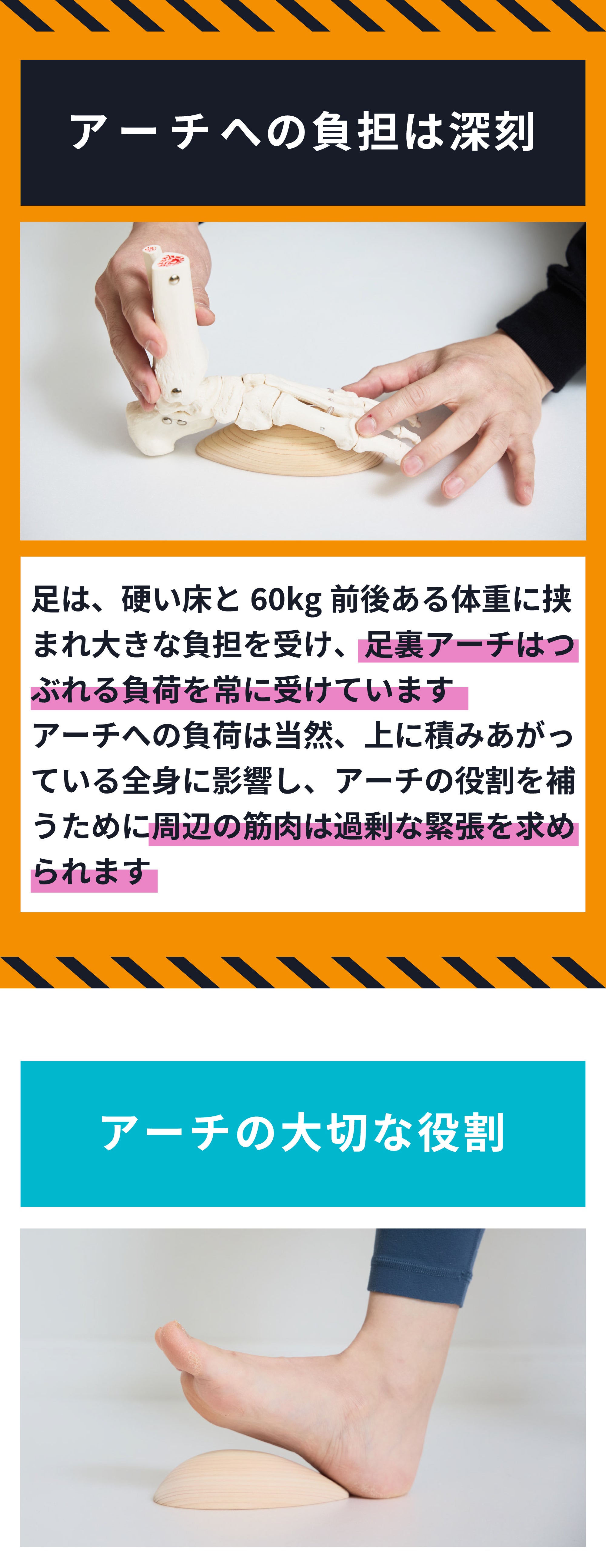 足裏アーチは本来、衝撃を吸収するクッションの役割をし、膝・腰・首など、体全体にかかる負担を和らげるとても重要な器官です。