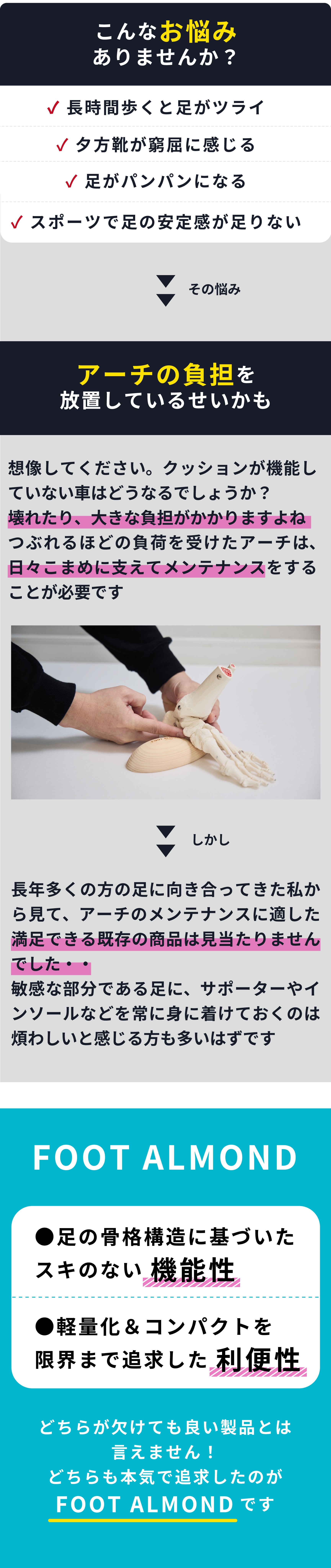 非常に個人差が大きいアーチですが、FOOT ALMONDは差し込み具合で調整でき、適切に支えることができます。