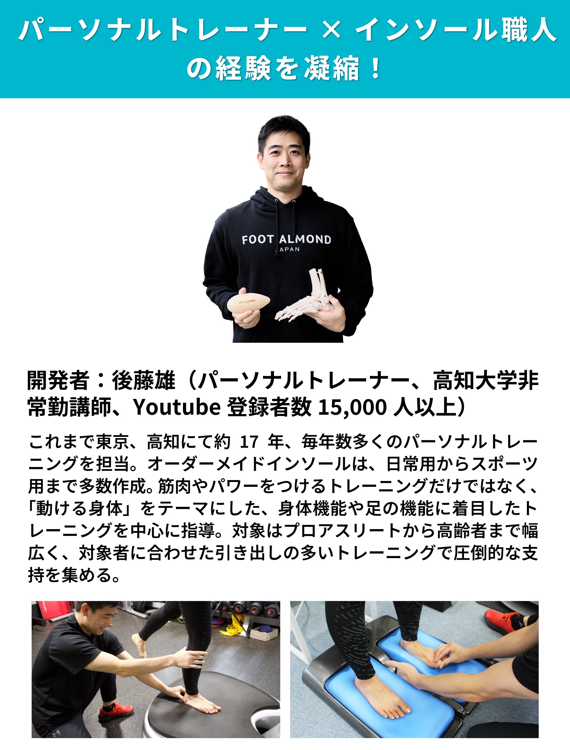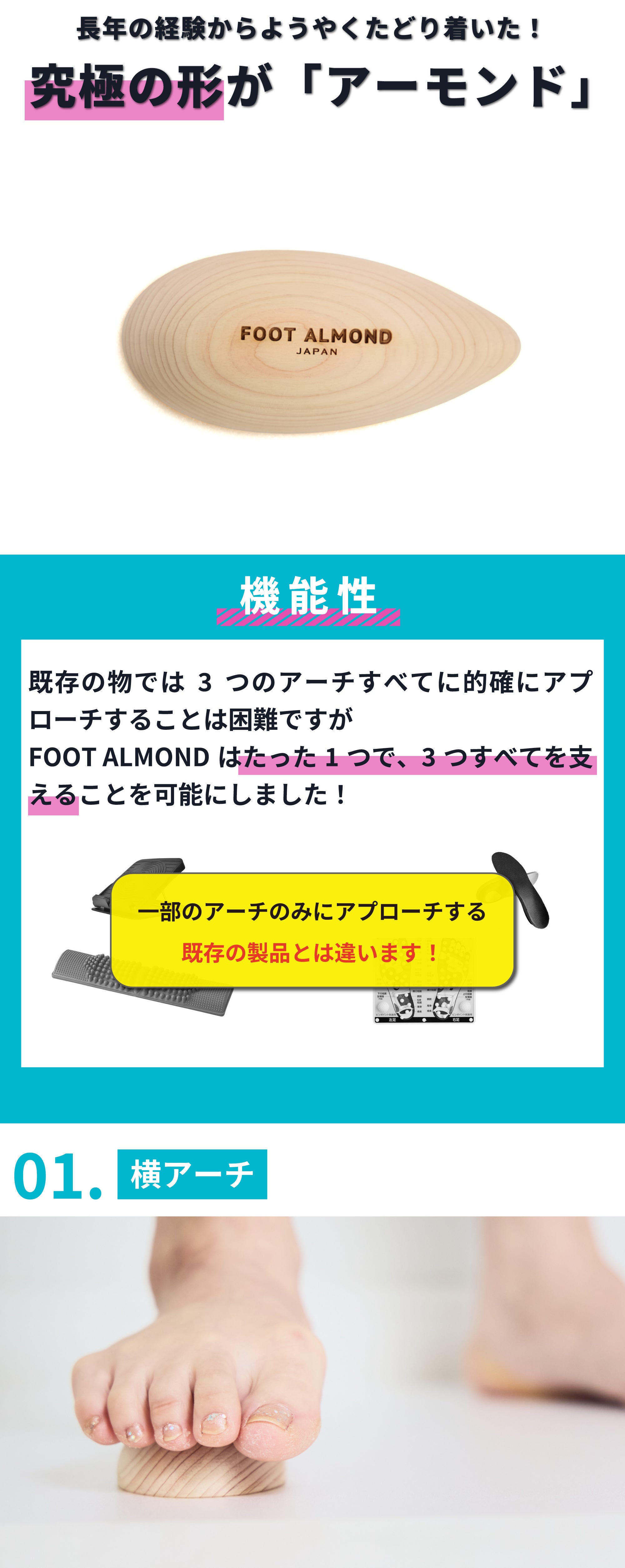 小さいアーチなので支えるのが難しいですが、FOOT ALMONDは先端が計算された薄さと幅になっているので、適切に支えることができます。
