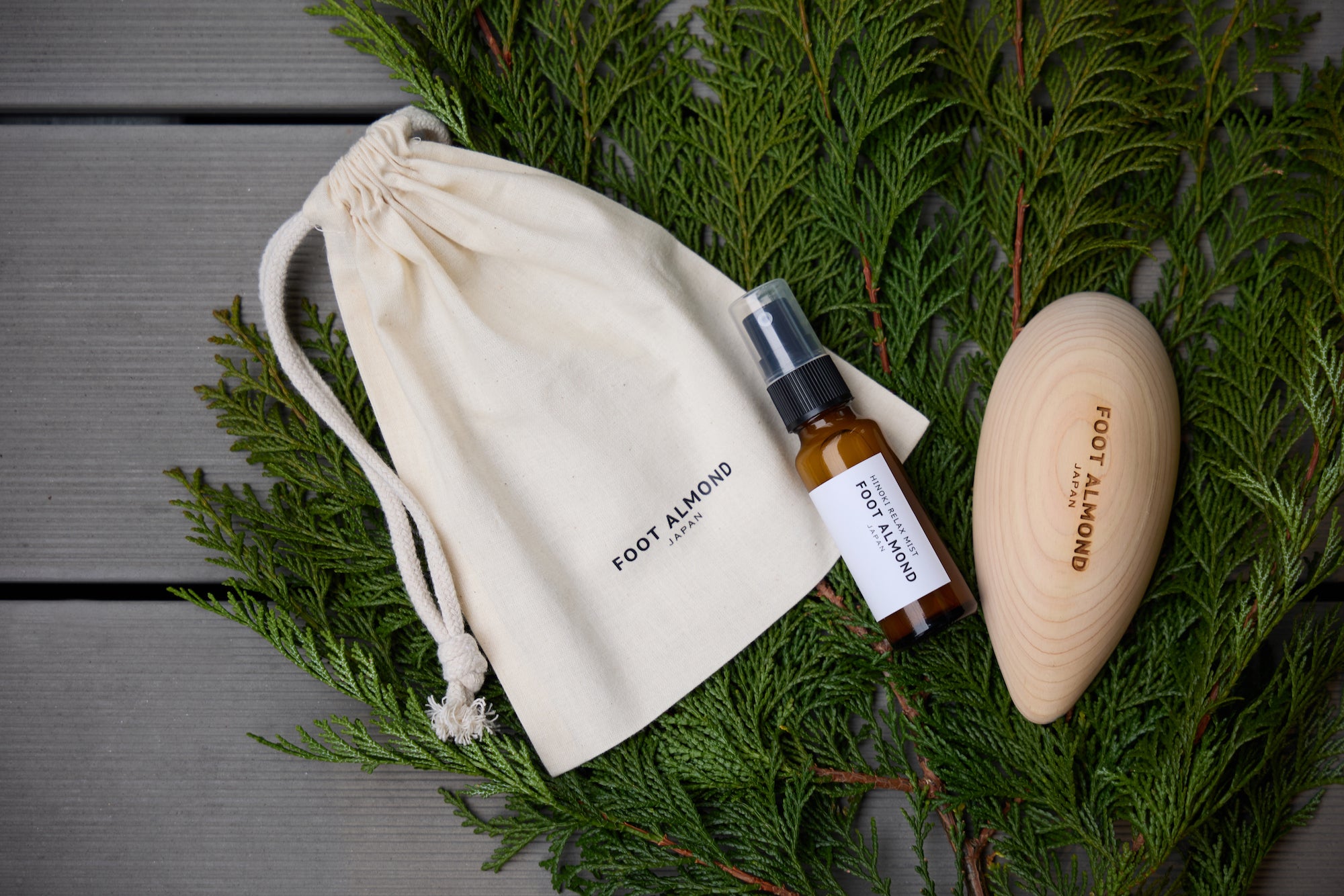FOOT ALMONDには土佐ひのきの無垢材を、HINOKI RELAX MISTには土佐ひのきのエッセンシャルオイルを使用しています。日射量も雨量も多い高知県で育つ土佐ひのきは、油脂分をたくさん含んでおり、爽やかで清涼感のある香りが特徴です。
