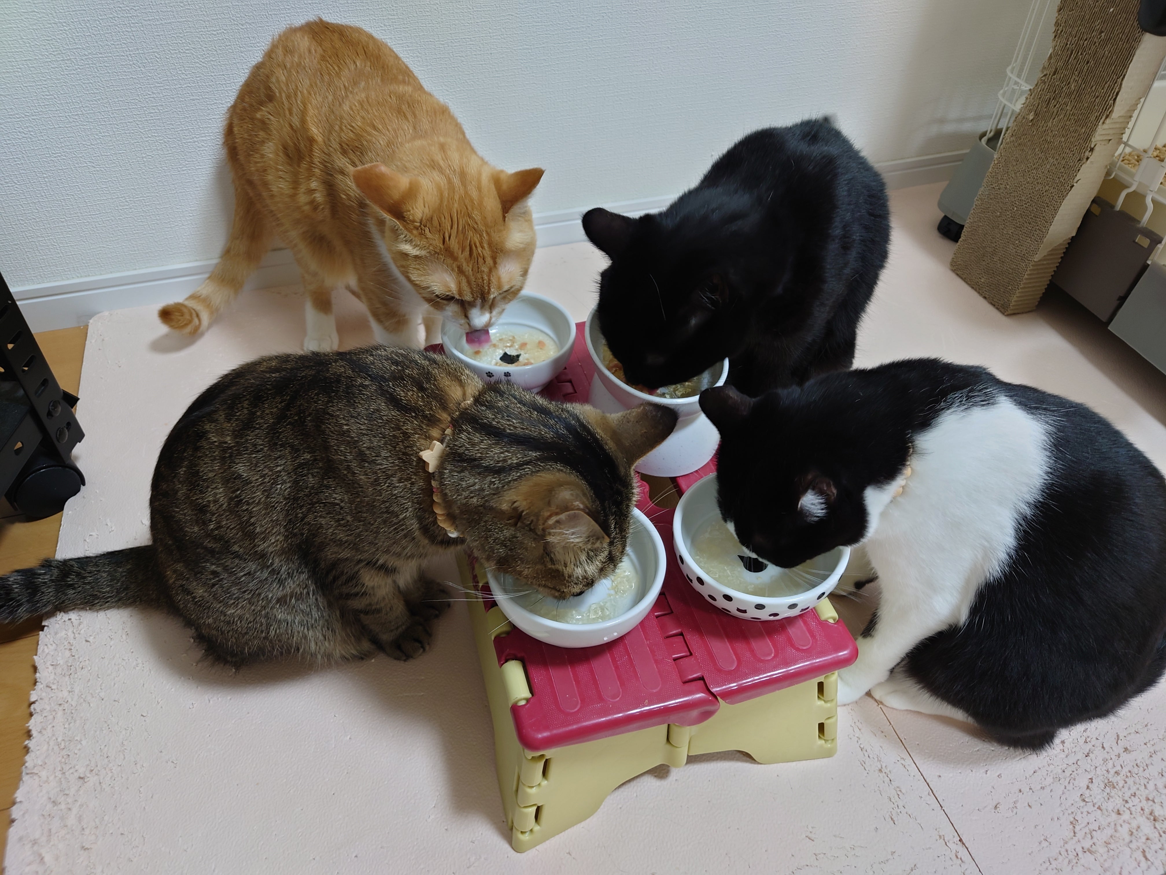 毎日のおやつタイムに、大好きなジュレッタを食べる我が家の4にゃん。これからも応援してます。