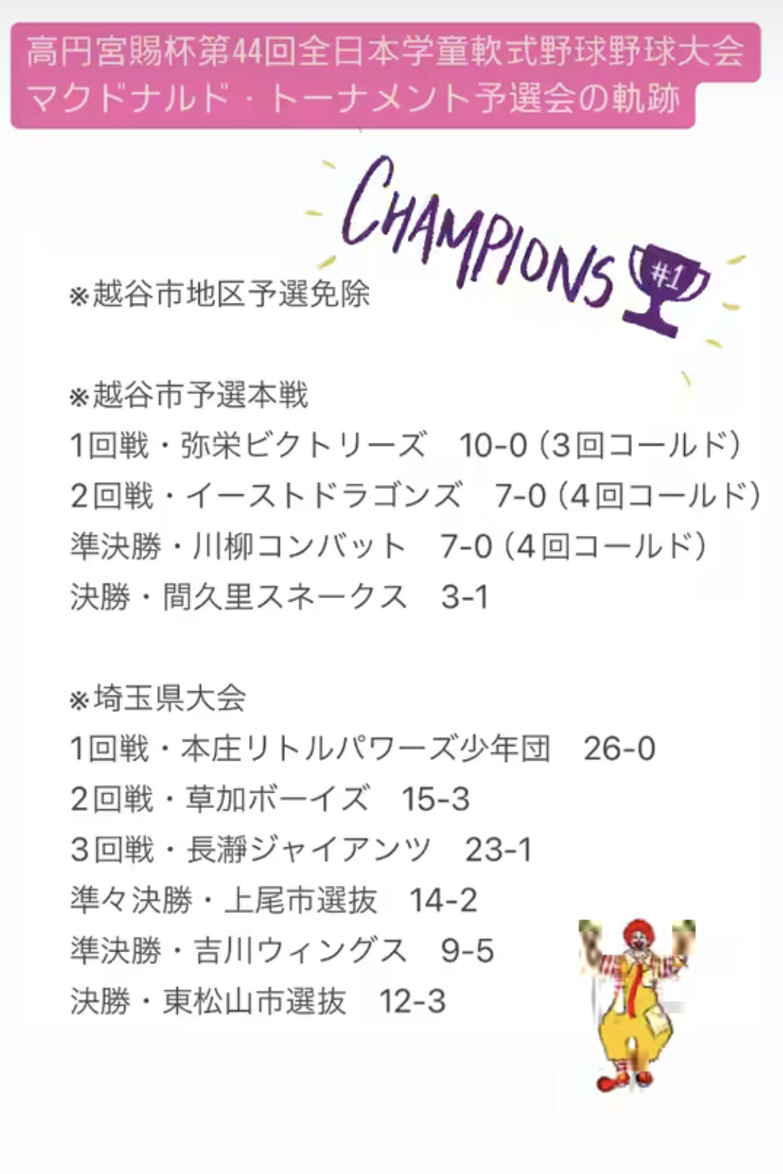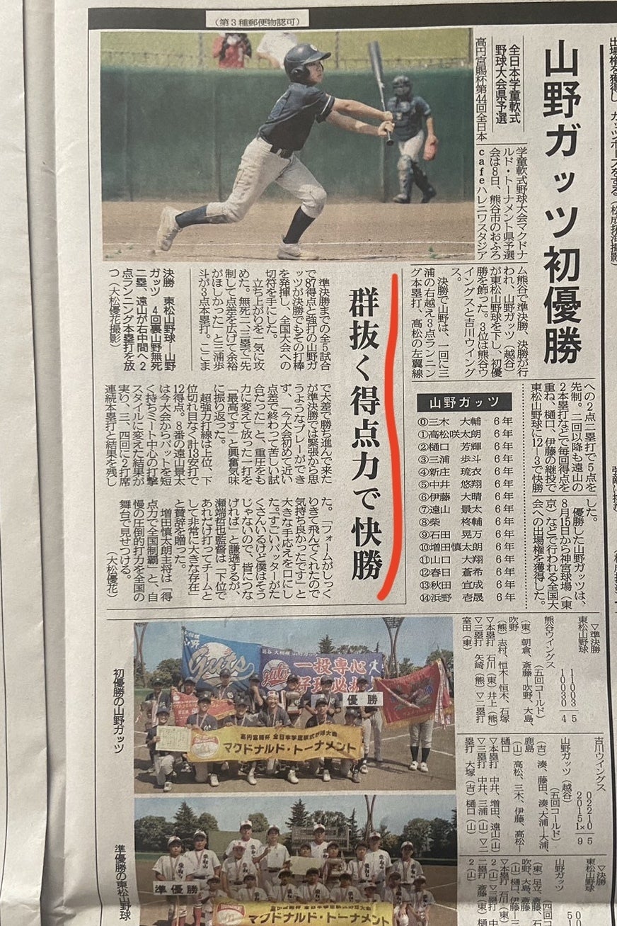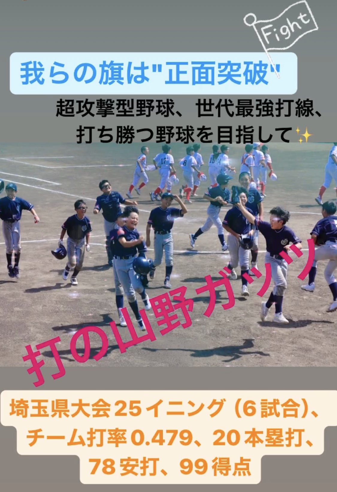 埼玉県大会においてもチーム打率0.479、20本塁打、99得点を(調べられる限り...大会記録)叩き出し圧倒的スコアで昇り詰めました。