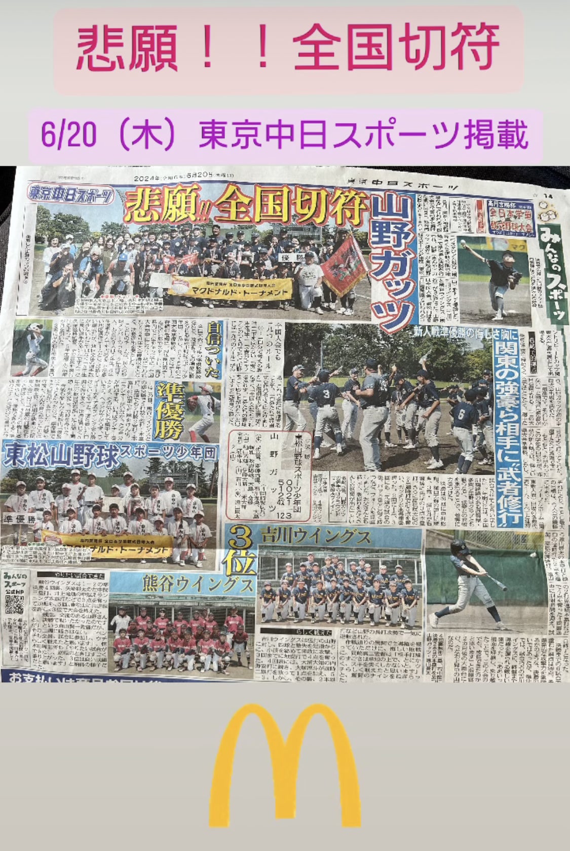 2024/08/18 20:36本日の全国大会2回戦の相手は、前年覇者、今大会も優勝候補筆頭の新家スターズさん(大阪府)でした。途中逆転するも、最後の回で5点を返され、、、7-10で惜しくも敗れてしまいました。少年野球の全てをかけた夢舞台。全日本学童マクドナルドトーナメント、親子の物語はこれにて堂々完結。ワッペンをつけて神宮で行進、神宮で初勝利、最後は最高の相手、最高の夏でした。ご支援くださった皆さま、ありがとうございました。山野ガッツの戦いは続きます。引き続き応援していただけたら幸いです。本当に本当に本当ーに、ありがとうございました!Instagramhttps://www.instagram.com/reel/C-zmiVNpvYs/?igsh=YW1seWt5bjVrbGk4 もっと見る