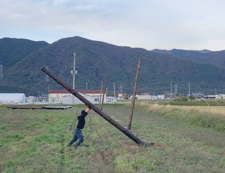 高さ5mにもなるホップのために、永源寺の山から木を切り出してもらい、自ら地面に支柱の穴を開け、ワイヤーを貼り、ホップの株の植え付けました。