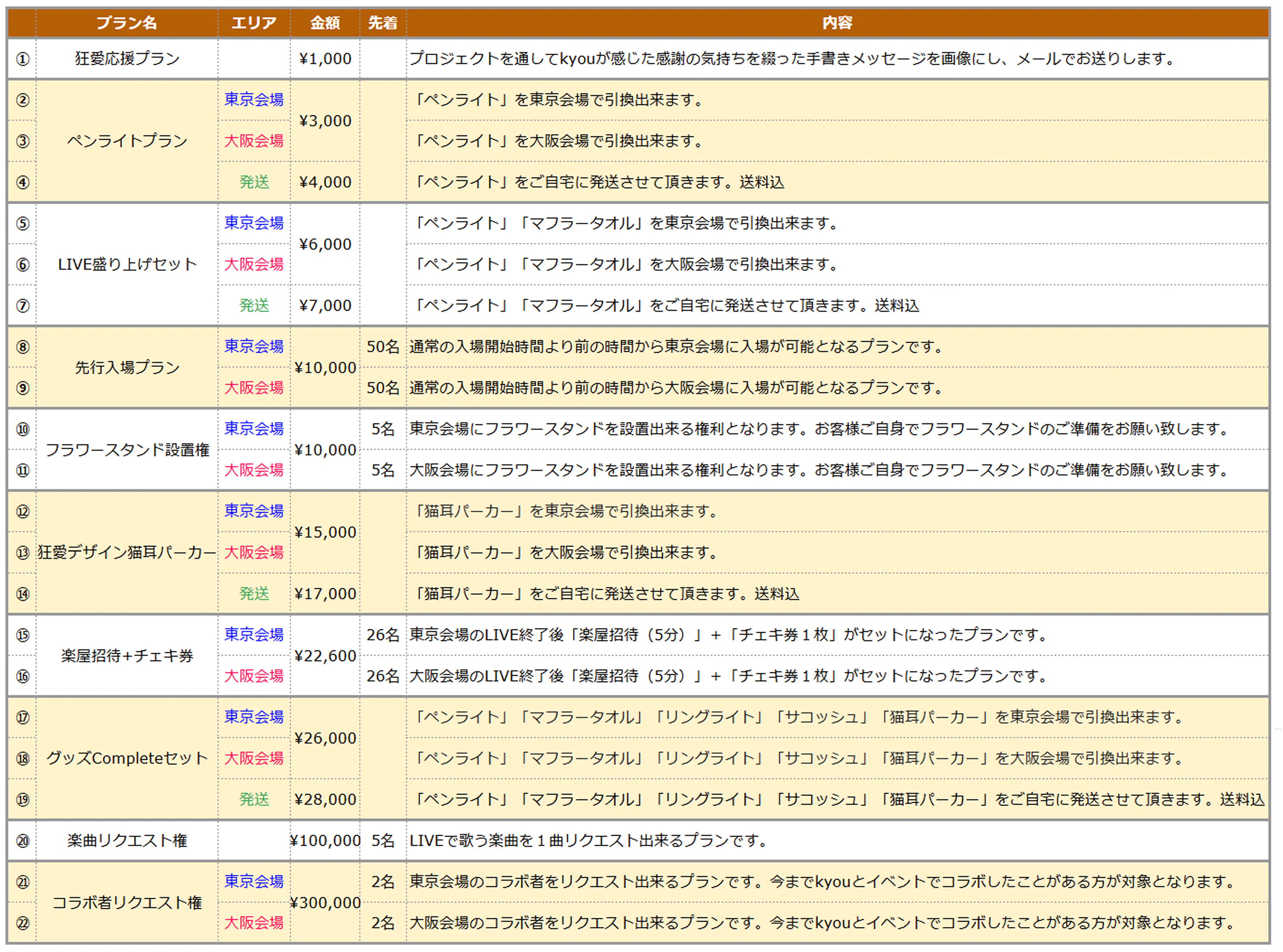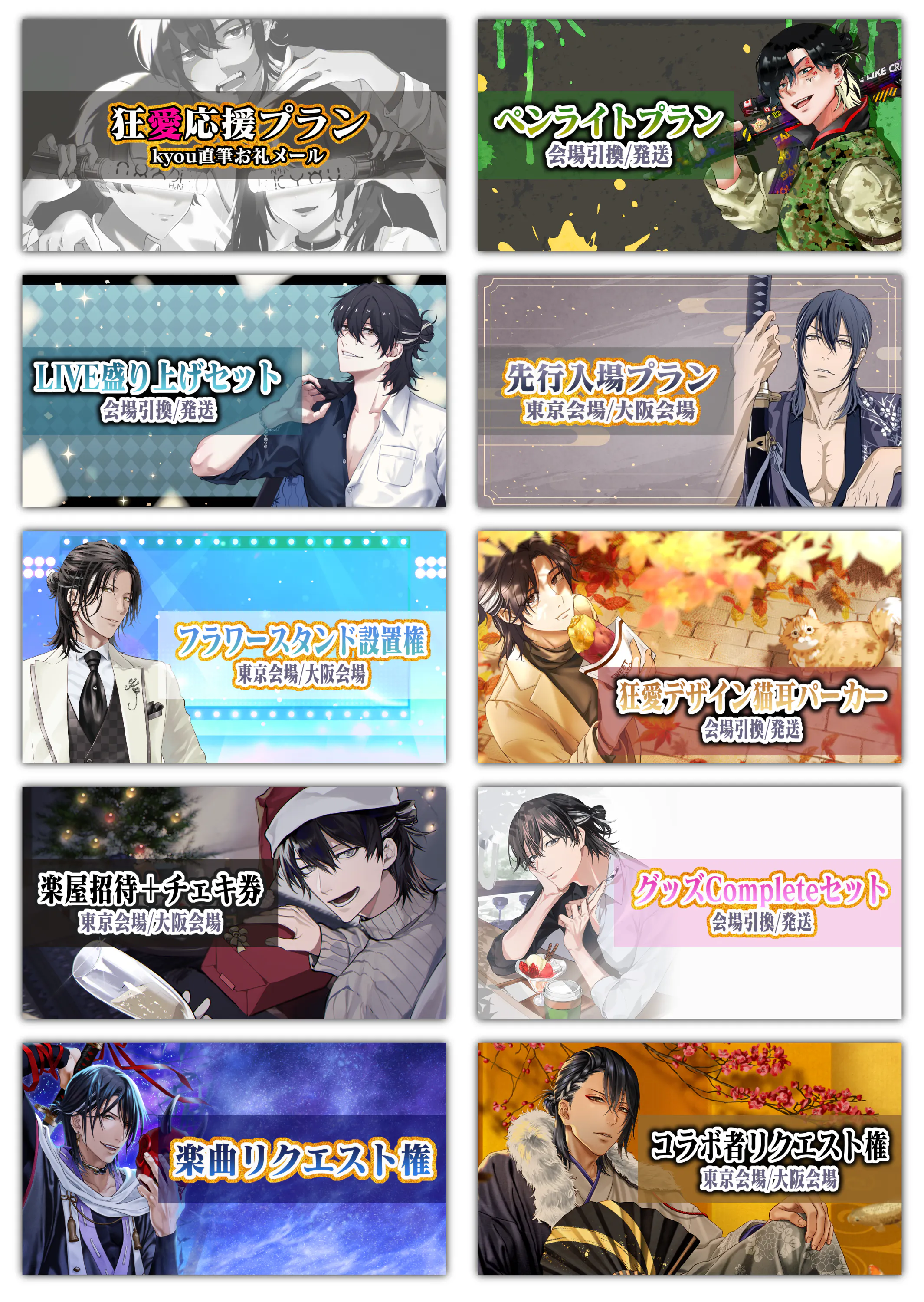 リターン品は全10プラン合計22種!「東京会場で引換」「大阪会場で引換」「ご自宅への配送」など支援者様に沿ったプランをお選びいただけます。