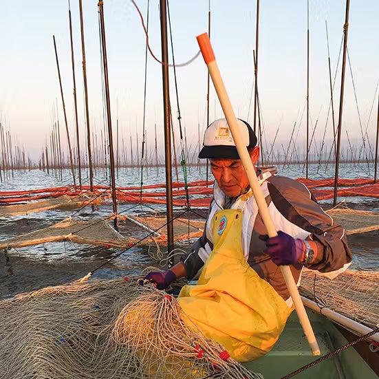 佐賀では、海苔を生産する漁師さんを「海苔師」と呼び、その仕事に尊敬を込めています。海苔作りは冬の寒い時期に行われる厳しい作業ですが、その努力が詰まった「一番摘み」の海苔は、特に柔らかく口の中でとろけるような食感が魅力です。地元でもなかなか手に入らない逸品で、その風味は格別です。海苔師けんろうさんが手掛ける「海苔師の焼」は、一番摘みの香りが楽しめる焼き海苔。「海苔師の味」は控えめな味付けで上品な風味が特徴です。そして「海苔師の塩」は、天然塩とバージンオリーブオイルで仕上げた一品。どの海苔も、おにぎりや巻き寿司に使えば、その風味が一層引き立ちます。ぜひ、極上の海苔の味わいをお楽しみください。