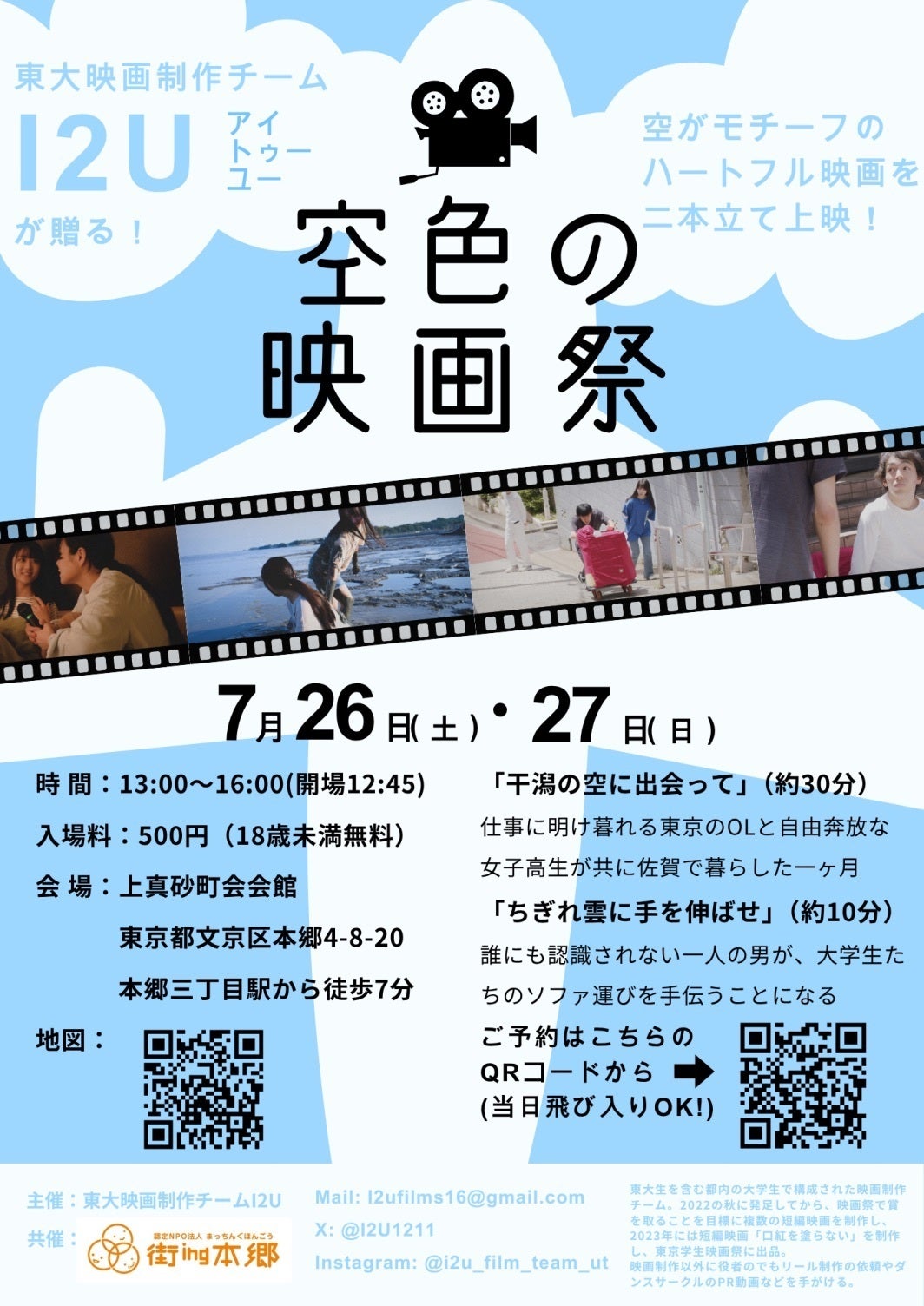 2025/07/14 20:35【クラファン支援者の皆さまへ:上映会のご案内】いつも温かいご支援をいただき、本当にありがとうございます。このたび、皆さまのご支援により完成した映画『干潟の空に出会って』を、東京・本郷にて上映する運びとなりました。佐賀での撮影から編集まで、多くの方に支えられて完成した作品を、ぜひスクリーンでご覧いただければ幸いです。【空色の映画祭】日時:2025年7月26日(土)・27日(日)13:00〜16:00(開場12:45) 会場:上真砂町会会館(東京都文京区本郷4-8-20) 本郷三丁目駅より徒歩7分 入場料:500円(18歳未満無料)==クラファン支援者は支援画面を提示で無料! ご予約フォーム https://docs.google.com/forms/d/e/1FAIpQLScUkNSM1Adzid8ducIko79OipkUO-uhYH4N5RzBTMEKooemKw/viewform【上映作品】『干潟の空に出会って』(約30分)東京から佐賀にやって来たOLと地元の女子高生が、一か月間の共同生活を通して心を通わせていくハートフル・ヒューマンドラマです。『ちぎれ雲に手を伸ばせ』(約10分)ひとりの青年が、偶然出会った大学生たちとの交流を通じて少しずつ心をひらいていく、もうひとつの“空”の物語。当日は監督やスタッフも参加予定です。ささやかではありますが、皆さまへの感謝の気持ちを込めた時間となればと思っております。お近くの方はぜひ足をお運びください。引き続き、どうぞよろしくお願いいたします。 もっと見る
