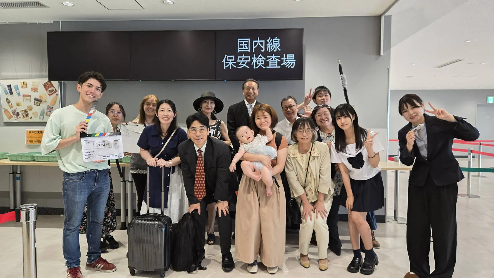 エキストラの方10人ほどとスタッフ、メインキャストと佐賀空港3階の国際線保安検査場の前のエリアを使用しました。その時だけ、表示を国内線にしていただき約2時間の撮影をしました!