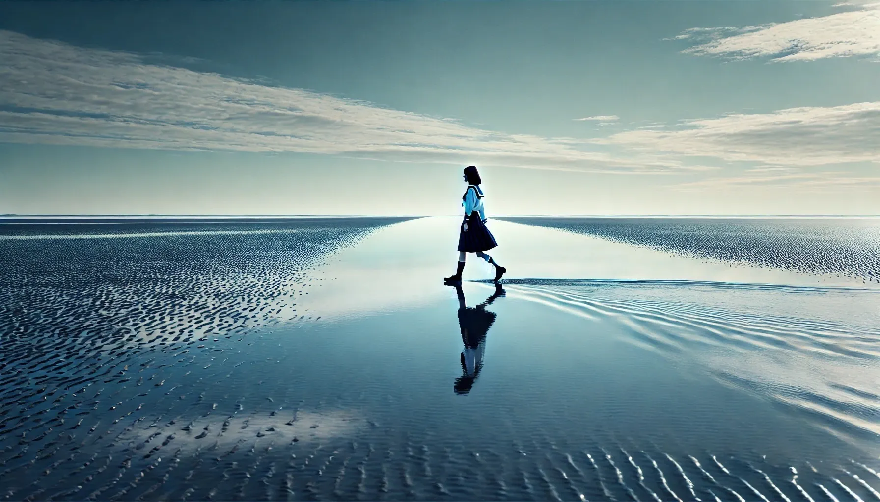 トップ画像にあるこの写真はChatGPTに干潟を歩く女子高生を描いてもらったものです。初めて生成したものではなく、空の比率や、本人の反射、雲の雰囲気など何度か繰り返しながら作りまました。実際干潟はもっと深く、ここまで綺麗に反射しませんが、いい参考になりました。