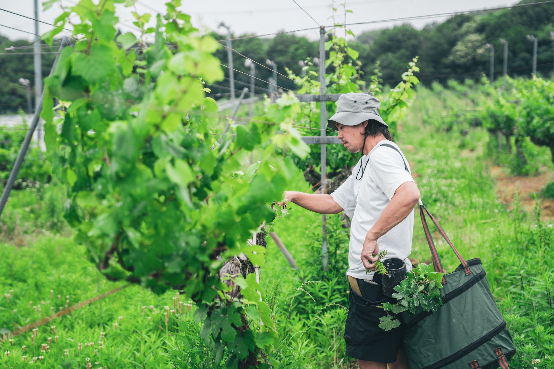神戸市北区のワイン用ぶどう畑で作業をする、宮本健司。