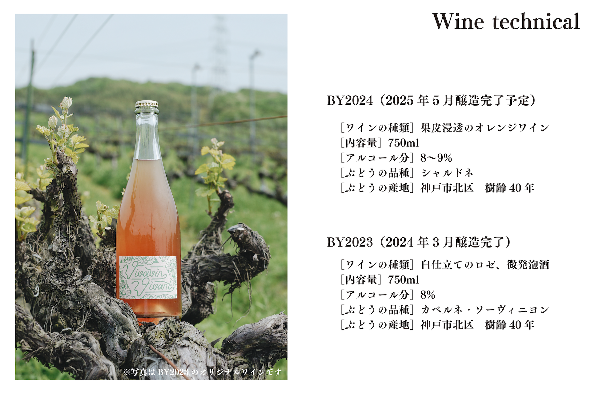 2022年は当初の予想を大きく下回る収量でしたが、なんとか収穫できたぶどうで委託醸造を行い、神戸で初めて150本のナチュラルワインが誕生しました。2023年はべト病の蔓延により、自身の有機栽培で育てたぶどうは全滅。周辺の生産者の方々から譲り受けた慣行栽培のぶどうを使用し、天然酵母で発酵、酸化防止剤無添加のワインを1,500本、街に届けました。