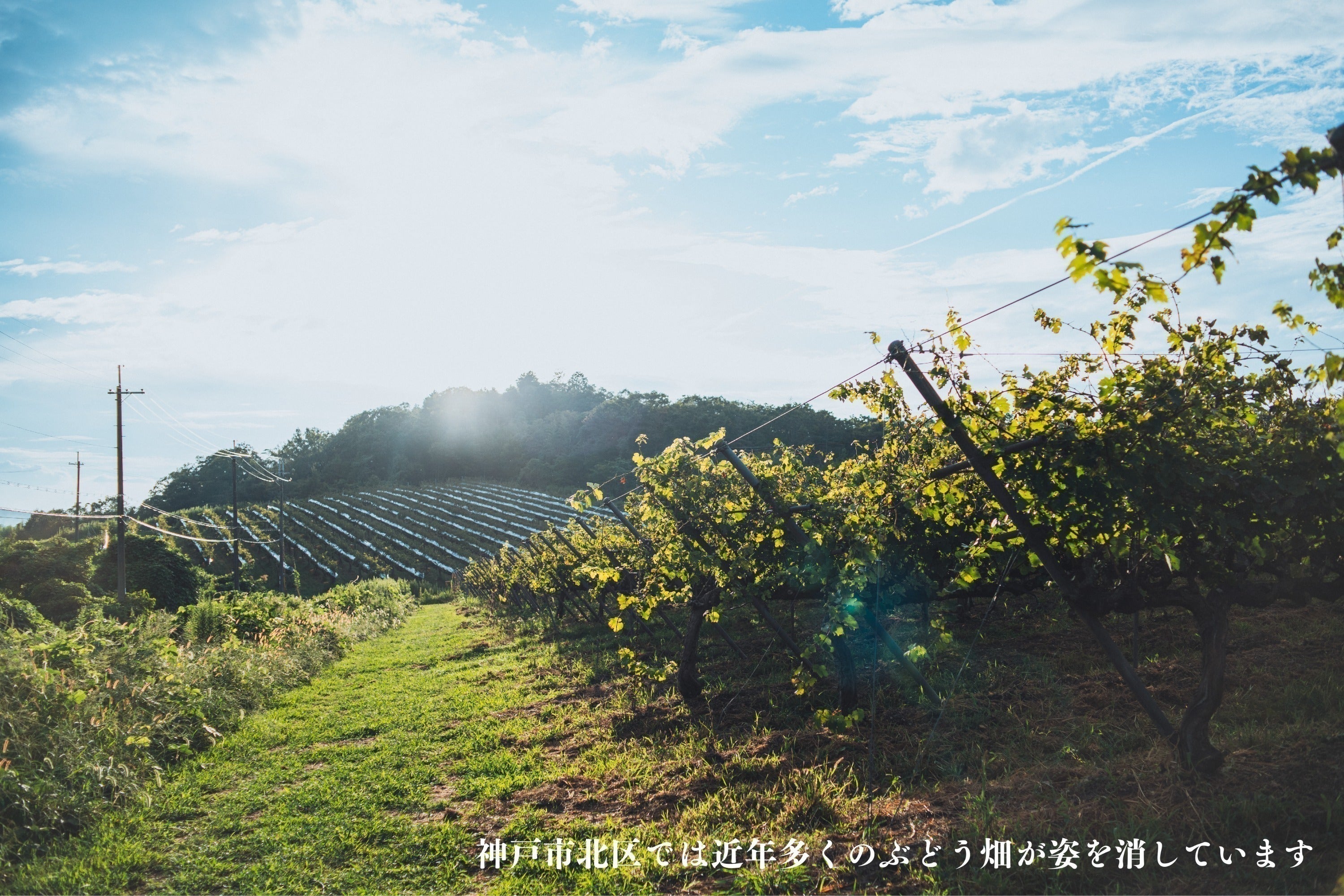 神戸市は、農業振興を目的に、40年前にワイン用のぶどう栽培を契約農家と開始し、神戸ワイナリーを創業。農村部に栽培総面積40ヘクタールという広大なぶどう畑が広がっていながら、長年の慣行栽培と異常気象により収量は年々減少、近年の不作により買取価格の下落と買取拒否、さらには生産者の高齢化と後継者不足も相まって、減反、伐採、栽培放棄が起こっている現状を知りました。