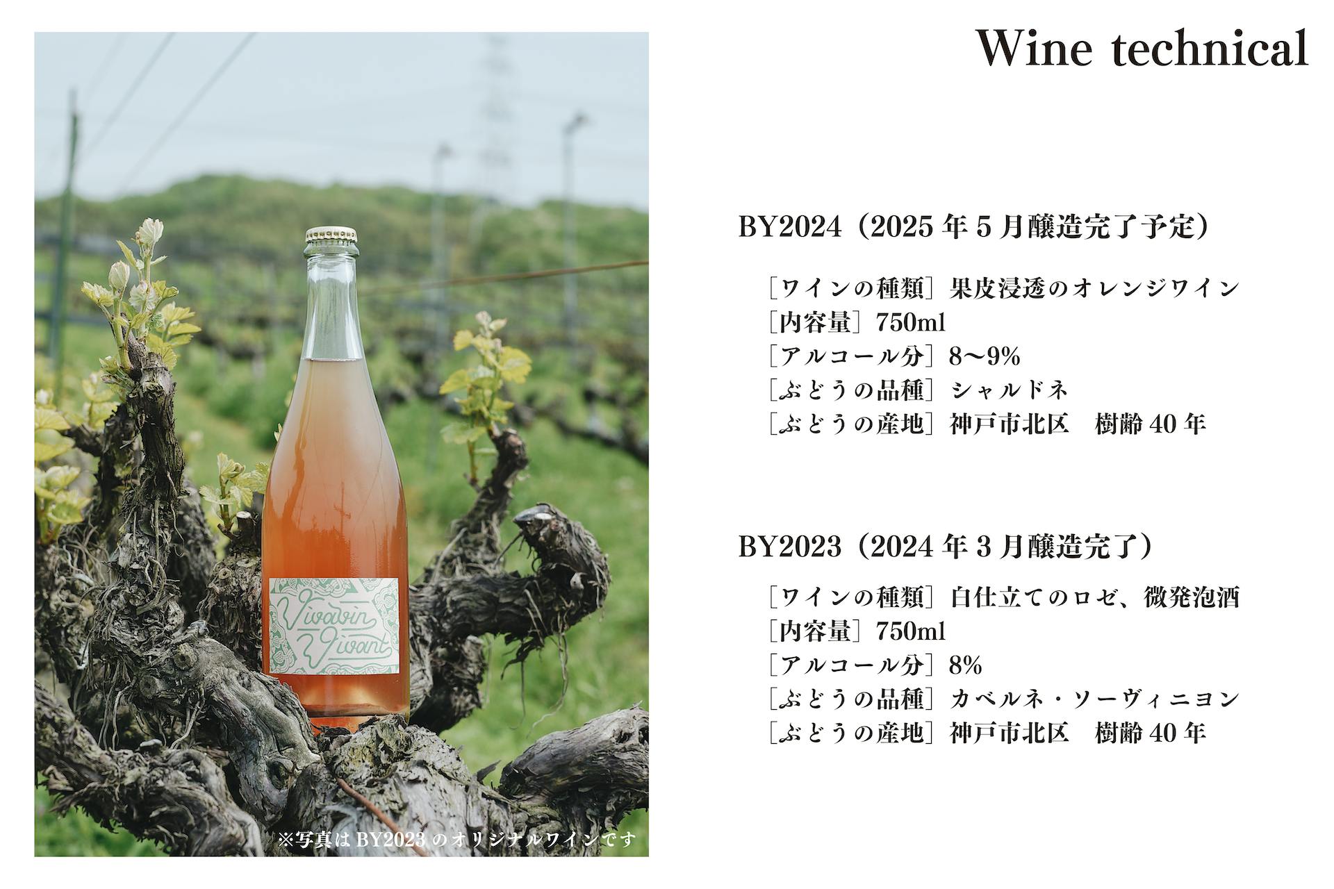 BY2024のワインは、今まさに栽培中のぶどうで、これから収穫を経て醸造となります。万が一 十分な収穫が出来ない場合、醸造が失敗してしまった場合は、該当支援者様にご連絡の上、「今年3月に完成したオリジナルワイン・BY2023」もしくは「宮本セレクトのナチュラルワイン」に変更させていただきます。ご理解のほど、よろしくお願いいたします。* BY:Brewery Yearの略で、「醸造年度」という意味です。