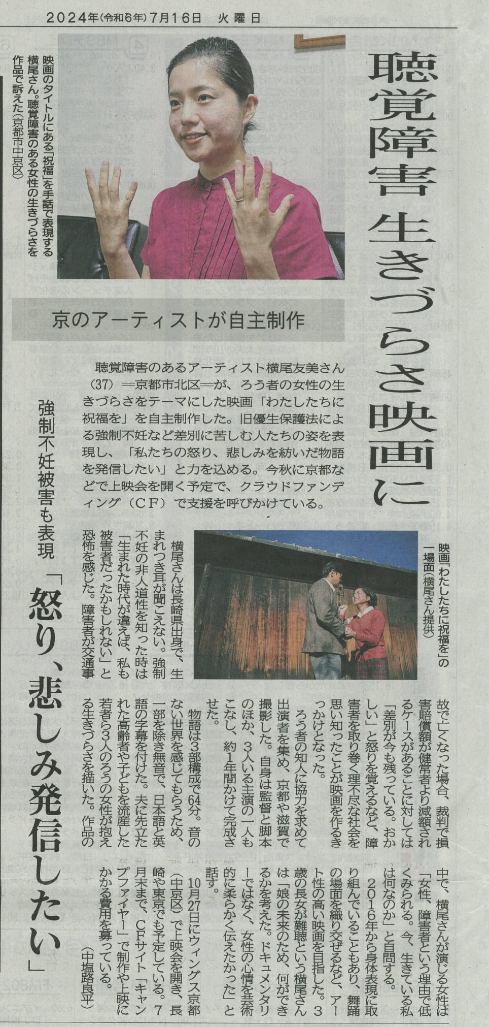 2024/07/22 13:59このプロジェクトへの応援やご支援をいただき、ありがとうございます…!「わたしたちに祝福を」映画が京都新聞、西日本新聞、長崎新聞に取り上げていただきました!改めて皆様に感謝申し上げます。7月31日まであと9日、このプロジェクトが終了するまで全力疾走しますので、引き続き応援お願いいたします。京都新聞の記事(2024/7/16)西日本新聞の記事(ヤフーニュース 2024/7/22公開)長崎新聞の記事(2024/7/19公開) もっと見る