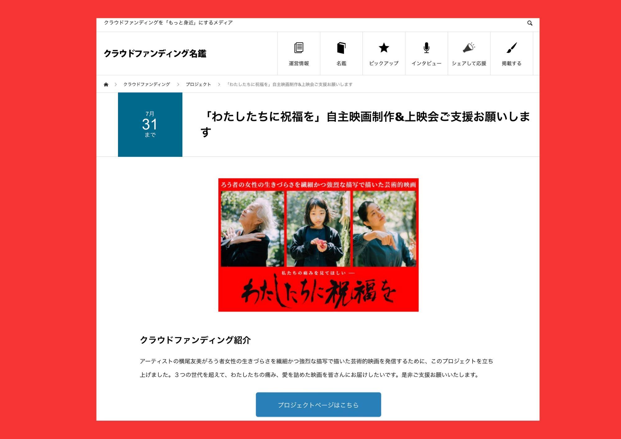 このクラウドファンディング名鑑は「クラウドファンディングをもっと身近に」をコンセプトとしたWebメディアで、クラウドファンディング好きの方はもちろん、あまり馴染みのない方でも「応援したいプロジェクトと より出会いやすくなる未来」を目指していて、これまでに1,000を超えるプロジェクトの紹介をされています。この度、「わたしたちに祝福を」のプロジェクトも紹介していただけることになり、大変うれしく思います…!
