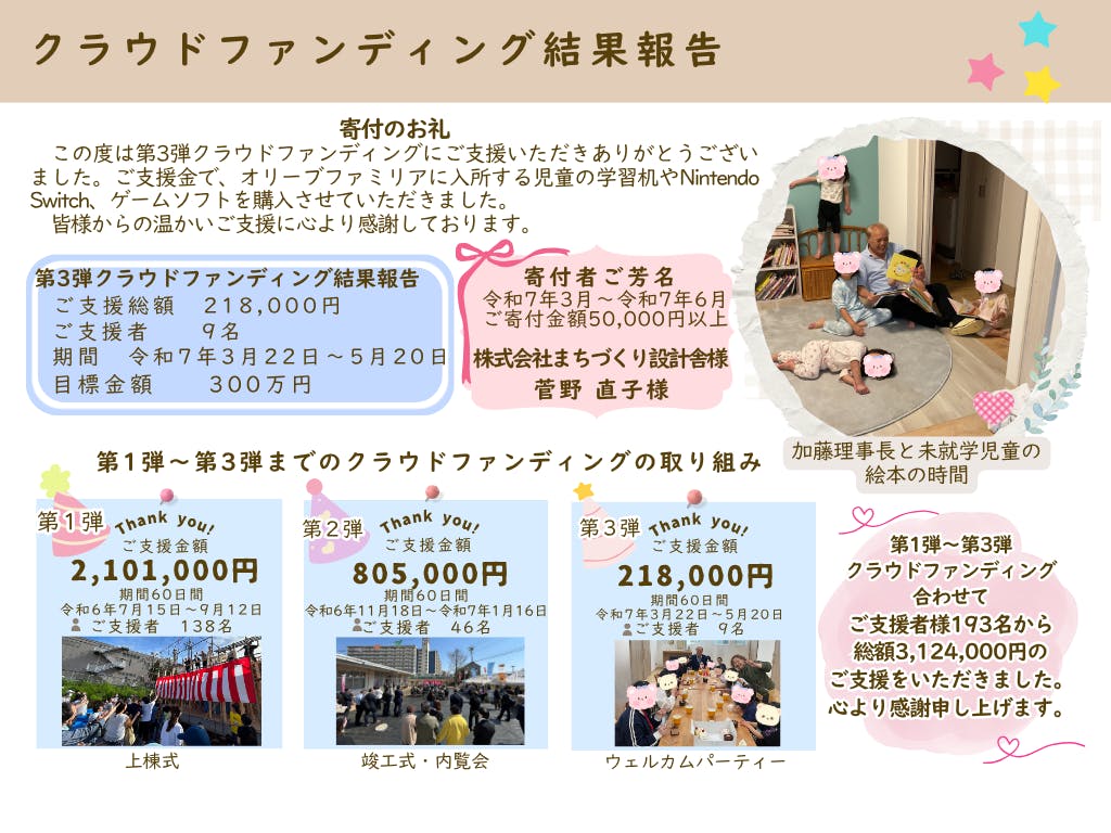 第一弾~第三弾クラウドファンディングで、ご支援者193名から総額3,124,000円のご支援をいただきました。心よりお礼申し上げます。