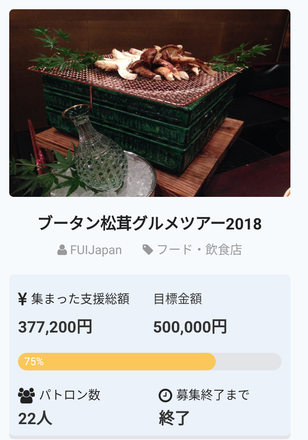 弊社では4年前からブータン産の松茸を輸入しており、好評を得ております。しかし、松茸は高級で、飲食店で食べることはなかなか難しい。そこで、お取引のある有名店様の協力のもと、手軽にブータン松茸を楽しめるイベントを行いたいと考えクラウドファンディングに応募しました。