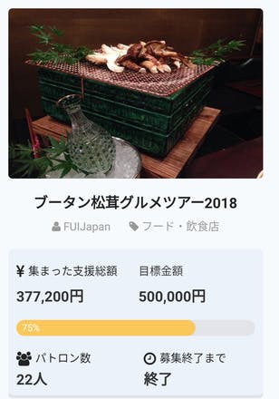 2018/06/27 21:08残り3時間を切りました。 おかげさまで目標金額の66%となりました! ラストスパートがんばります!! ブータン産松茸料理を破格、贅沢に有名飲食店で楽しむイベントです!ブータン産松茸を沢山の方に召し上がって頂きたく、有名飲食店様に無理言ってお願いした通常ではあり得ない破格の価格となっております。 儲け無しの還元イベントです。是非、ご検討宜しくお願い致します。 参加店一覧日本料理太月Bistaurant RNSQ(ビストランエレネスク)中国飯店三田店オッジダルマット もっと見る