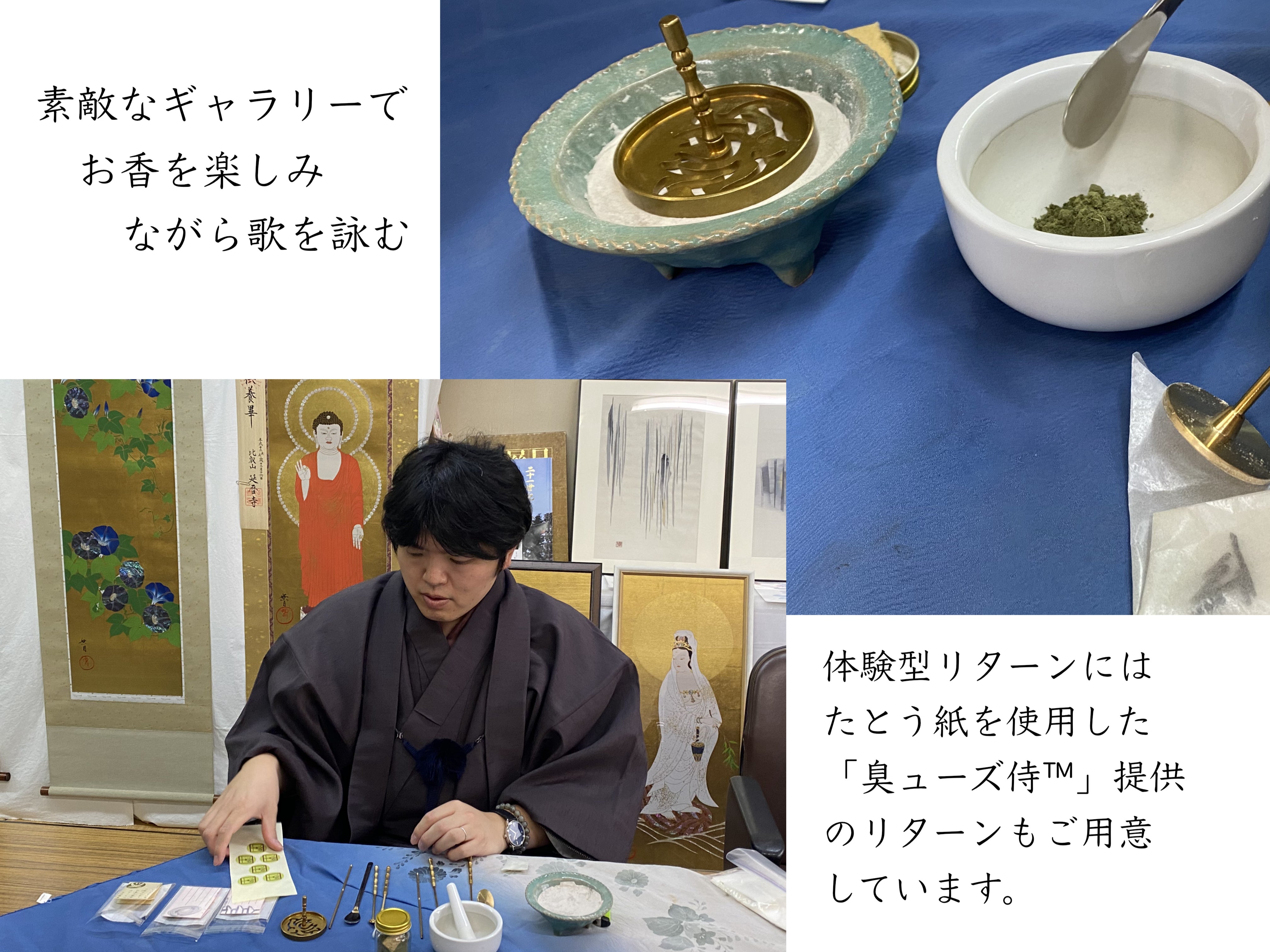 クラウドファンディングのために調香したお香を焚きながら、たとう紙に歌詠みやメッセージなどを書いてもらう体験です。