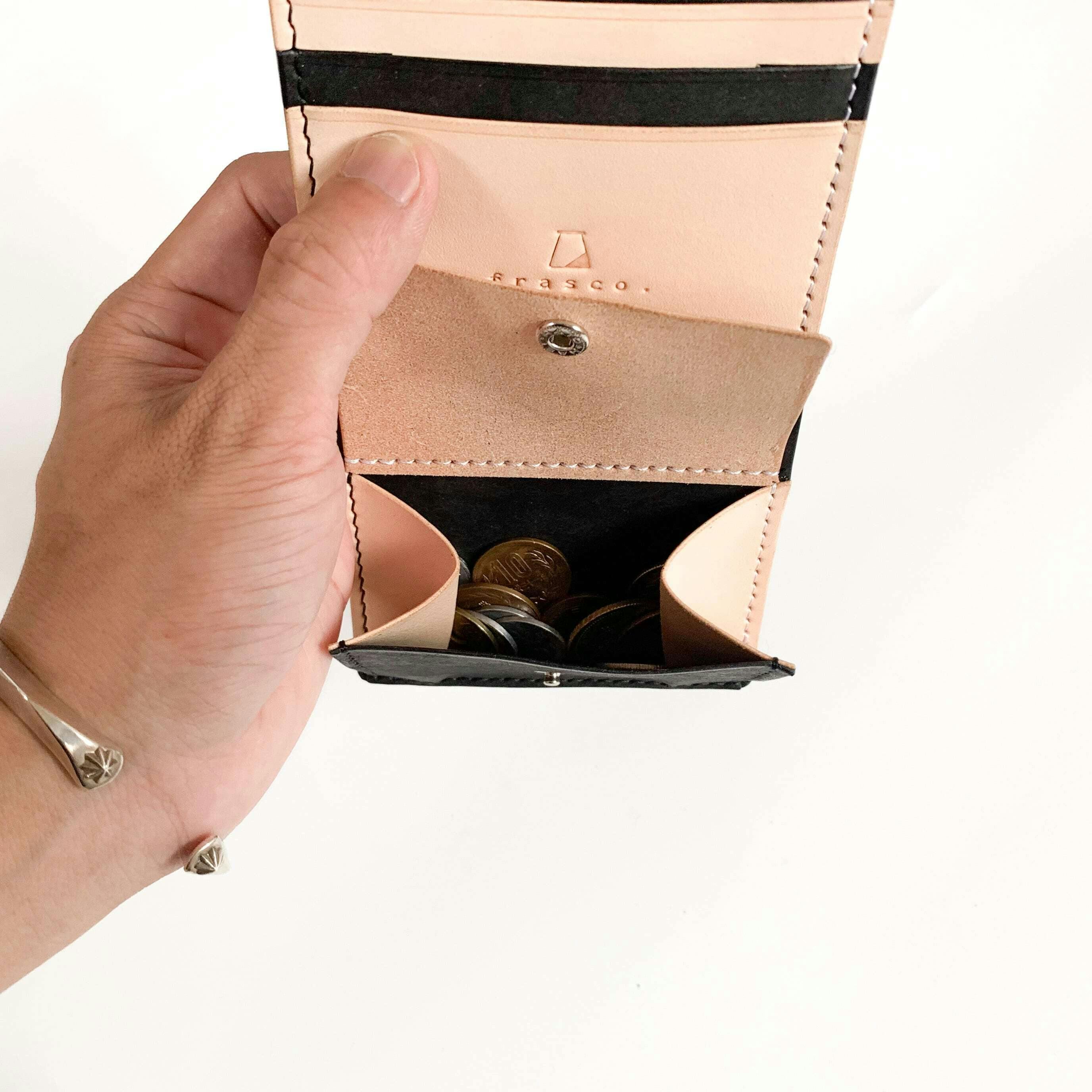 こちらの小銭ポケットは何度も修正を重ね縦横共に広い作りに仕上がりました。