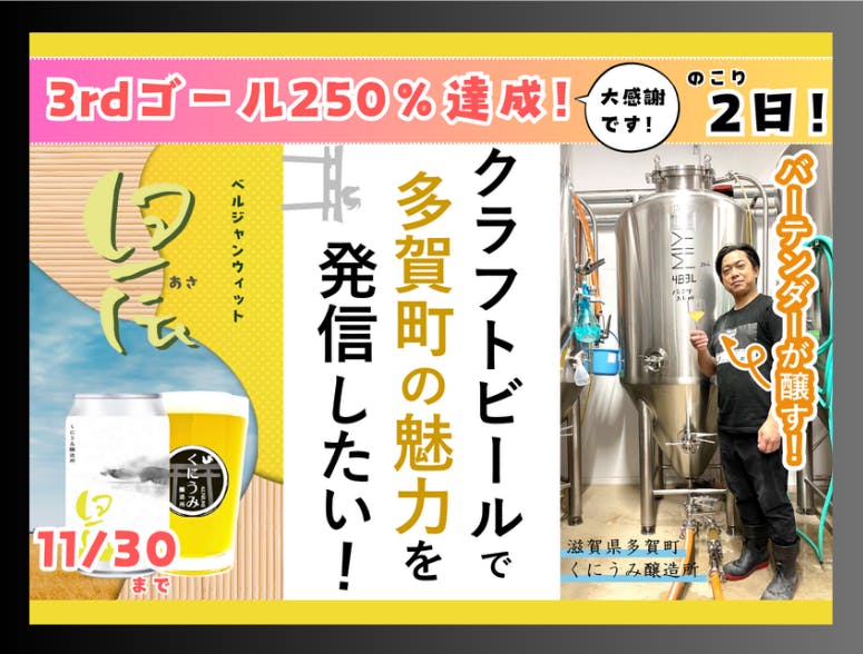 2024/11/28 13:28バタバタしており、しばらく活動報告が空いてしまってすみません。実は残り4日の時点で、3rdゴールを達成していました!まさかここまでたくさんの応援をいただけるとは、本当に嬉しい限りです。みなさまご支援いただきありがとうございます。早いもので、もう11月も終わり際。1日に始まった醸造も今のところは順調に進んでおり、着々とみなさまへのリターンの準備を進めております。このクラウドファンディングを通して、多くのあたたかいお言葉をいただき大変感無量です。残り2日。最後まで挑戦を続けますが、クラウドファンディングが終わってからもみなさんからいただいた想いを胸に、「美味しい」と言っていただけるビールの醸造に取り組んでまいります! もっと見る