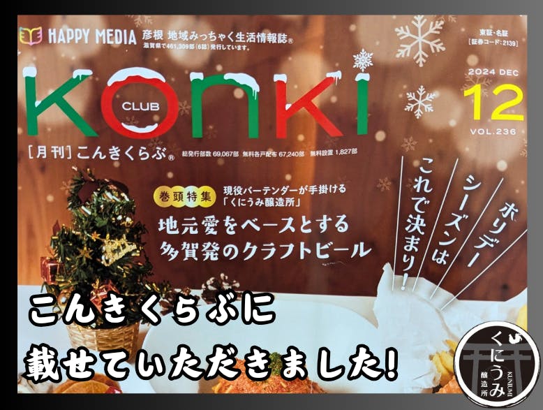 2024/11/29 19:19彦根市・多賀町・甲良町・豊郷町・愛荘町の5市町村で発行されているこんきくらぶ。その12月号になんと、くにうみ醸造所を掲載していただきました!表紙と特集ページを飾らせていただいています。12/31の深夜(1/1の早朝)もくにうみ醸造所は営業予定。多賀大社に初詣がてら、ぜひお店をのぞきに来てください。特集ページもきれいにまとめていただいたので、ご覧いただけると喜びます! もっと見る