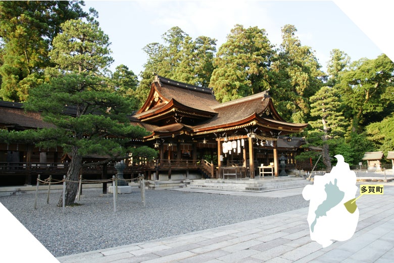 多賀町は多賀大社の祭神イザナミ大神が初めて天より降り立った地。神の坐所、「高」と呼ばれ、転じて多賀となったという説があります。伝承に登場する場所は今もご神木がそびえ立ち、信仰を集めます。