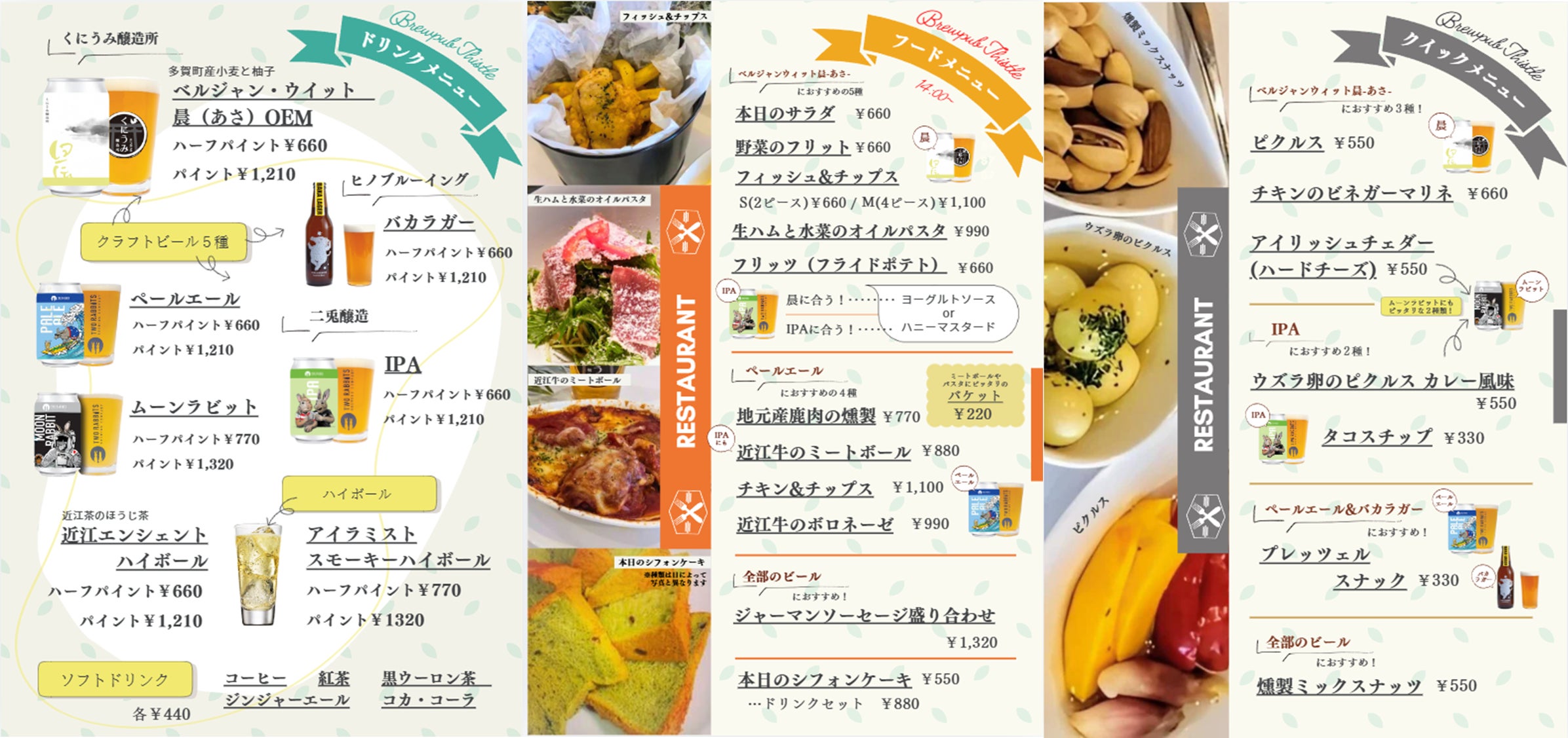 くにうみ醸造所はレストラン(「BREW PUB Thistle」)を兼ねており、こちらは今年八月にオープンいたしました。こちらではランチの他、ビアコーディネーターの資格を持つシェフによるペアリングメニューをお楽しみいただけます。