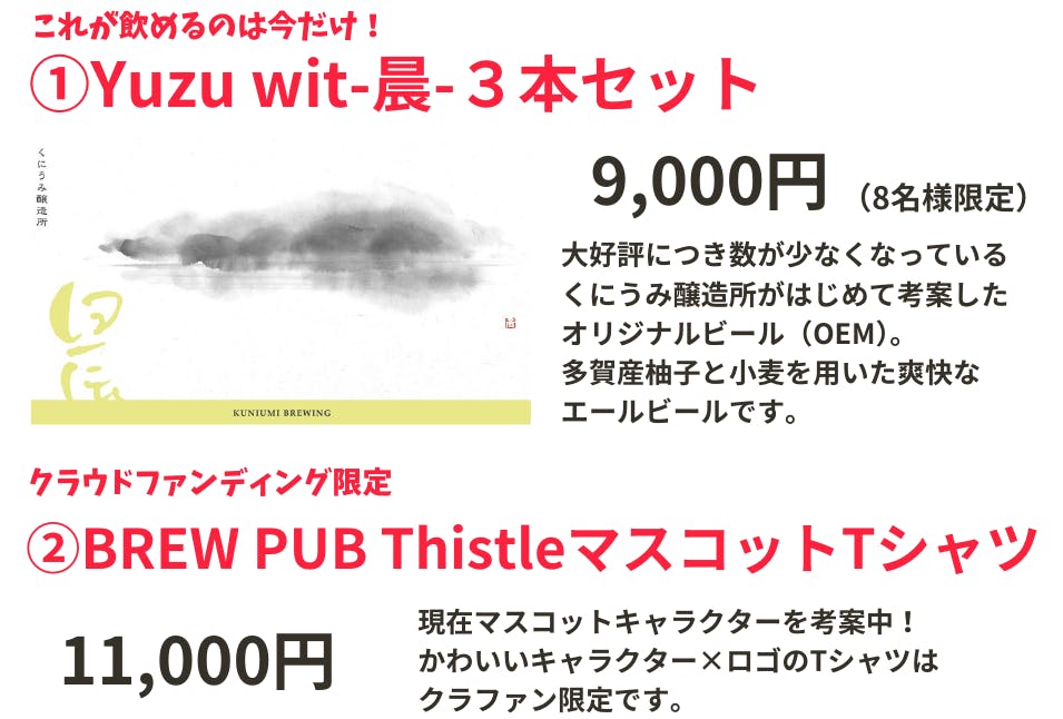 ・2万5千円:名前プレート掲載+BREW PUB Thistleでお使いいただける2割引きクーポン券6枚