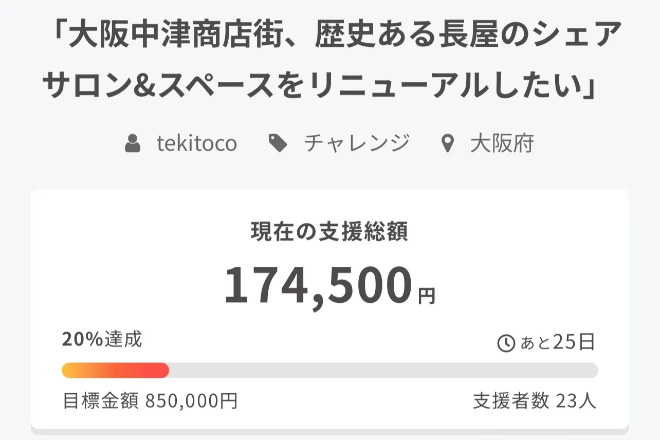 目標達成金額850,000円に対して、174,500円、達成率20%のご支援を頂戴しております。皆様のtekitocoへのご支援と応援に心より感謝申し上げます。