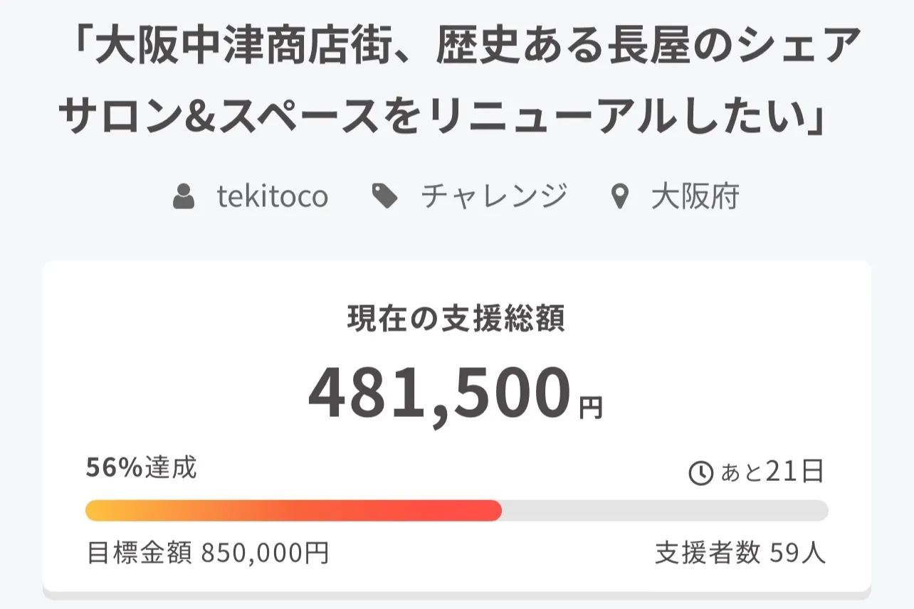 目標達成金額850,000円に対して、481,500円、達成率56%のご支援を頂戴しております。皆様のtekitocoへのたくさんのご支援と応援に心より感謝申し上げます。