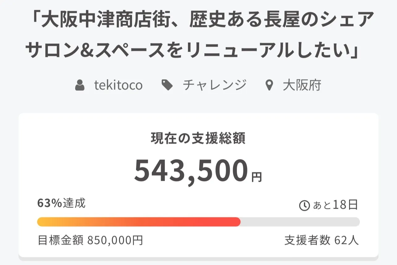 目標達成金額850,000円に対して、543,500円、達成率63%のご支援を頂戴しております。皆様のtekitocoへのたくさんのご支援と応援に心より感謝申し上げます。