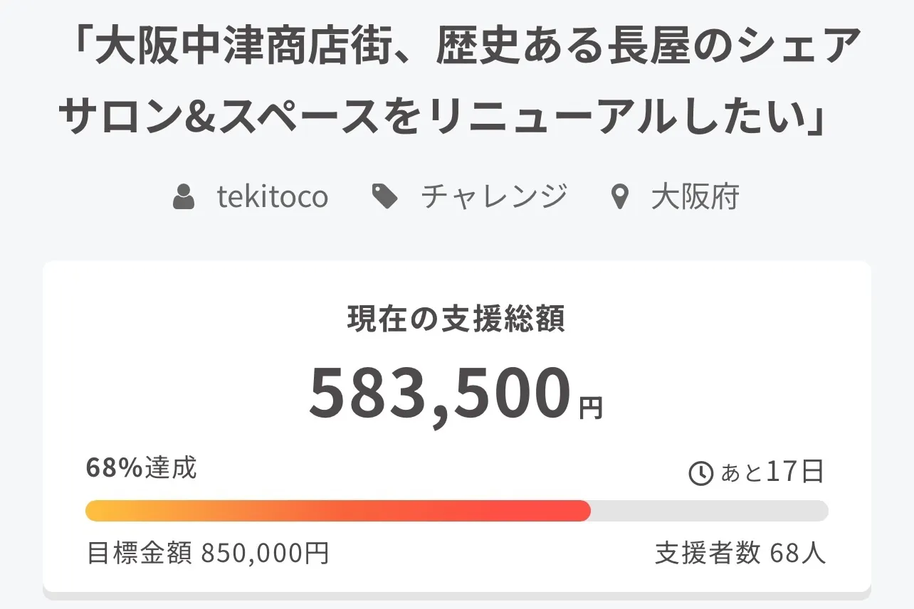 目標達成金額850,000円に対して、583,500円、達成率68%のご支援を頂戴しております。