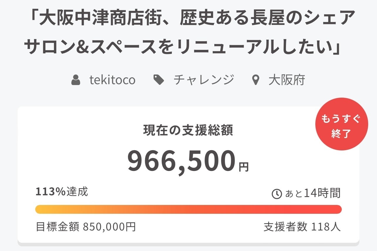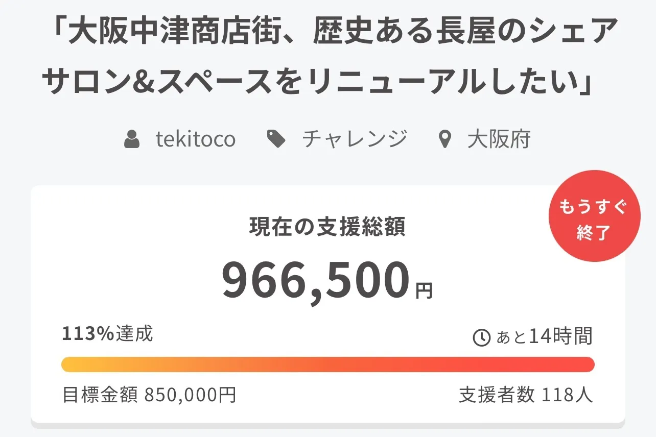 目標達成金額850,000円に対して、現在966,500円、達成率113%のご支援を頂戴しております。