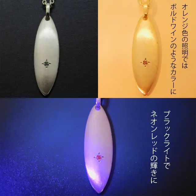 また、アレキサンドライトがボルドーカラーになる電球色の明かりの下では「赤」が強く出ると言う特徴も