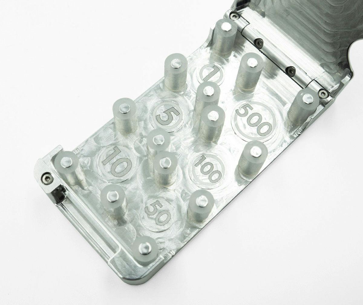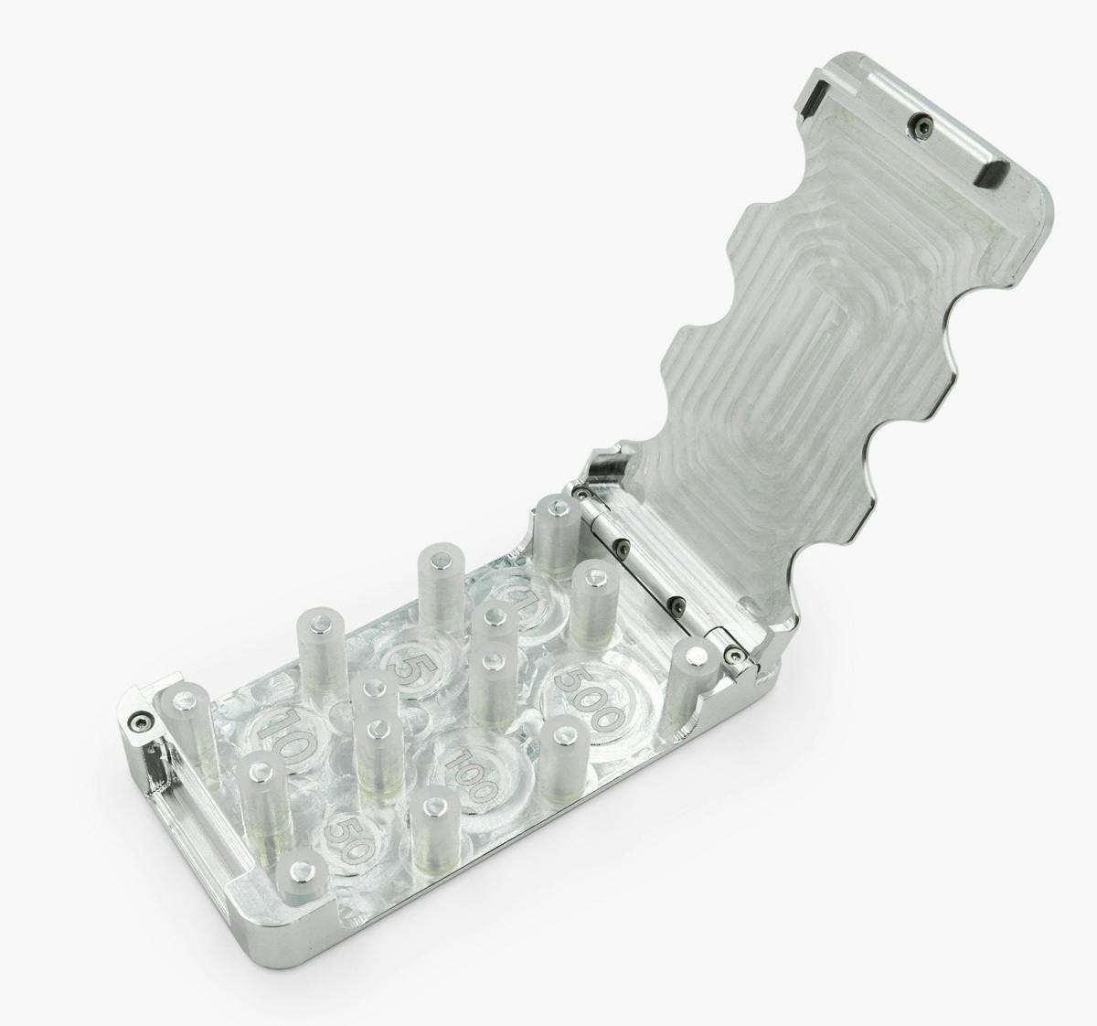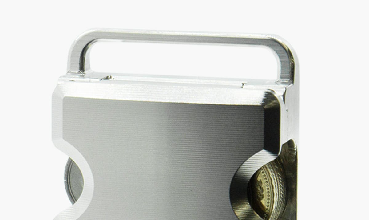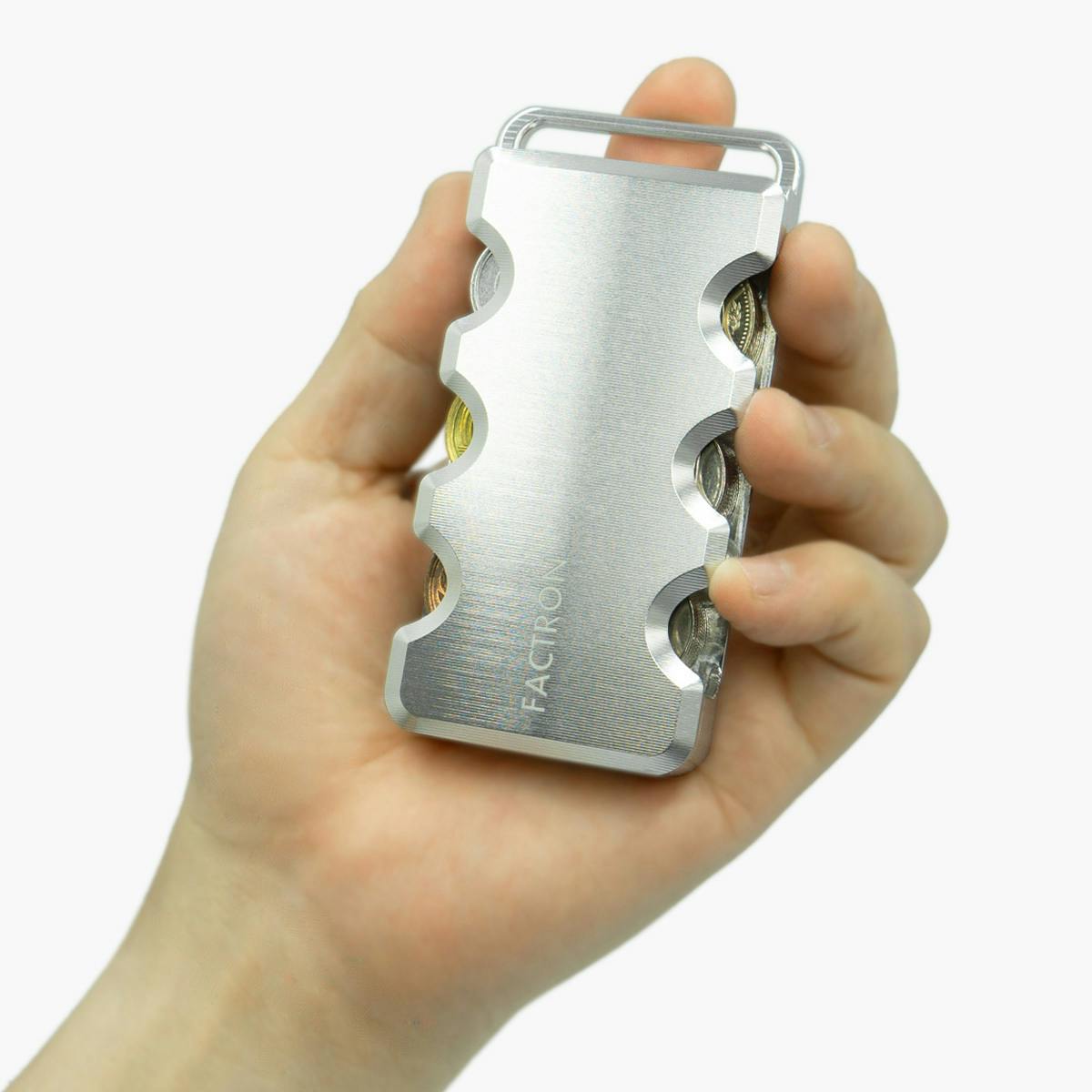 6種類の硬貨が入る『コインケースSIX』は、メタルウォレットの開発から派生したメタル削り出しコインケース。