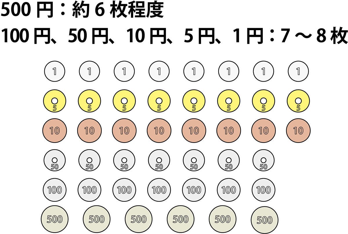 ・500円:6枚・100円、50円:7枚・10円、5円、1円:8枚