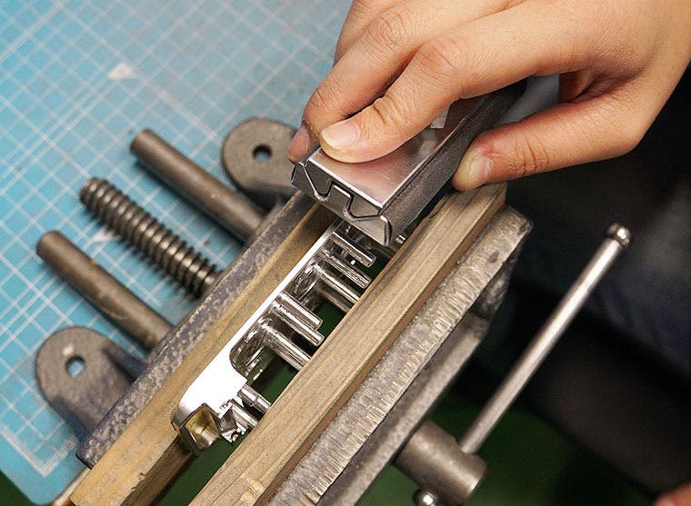 東京大田区の自社デザイン工房で、1点ずつじっくりと時間をかけて削り出し、手仕上げで磨いて組み立てます