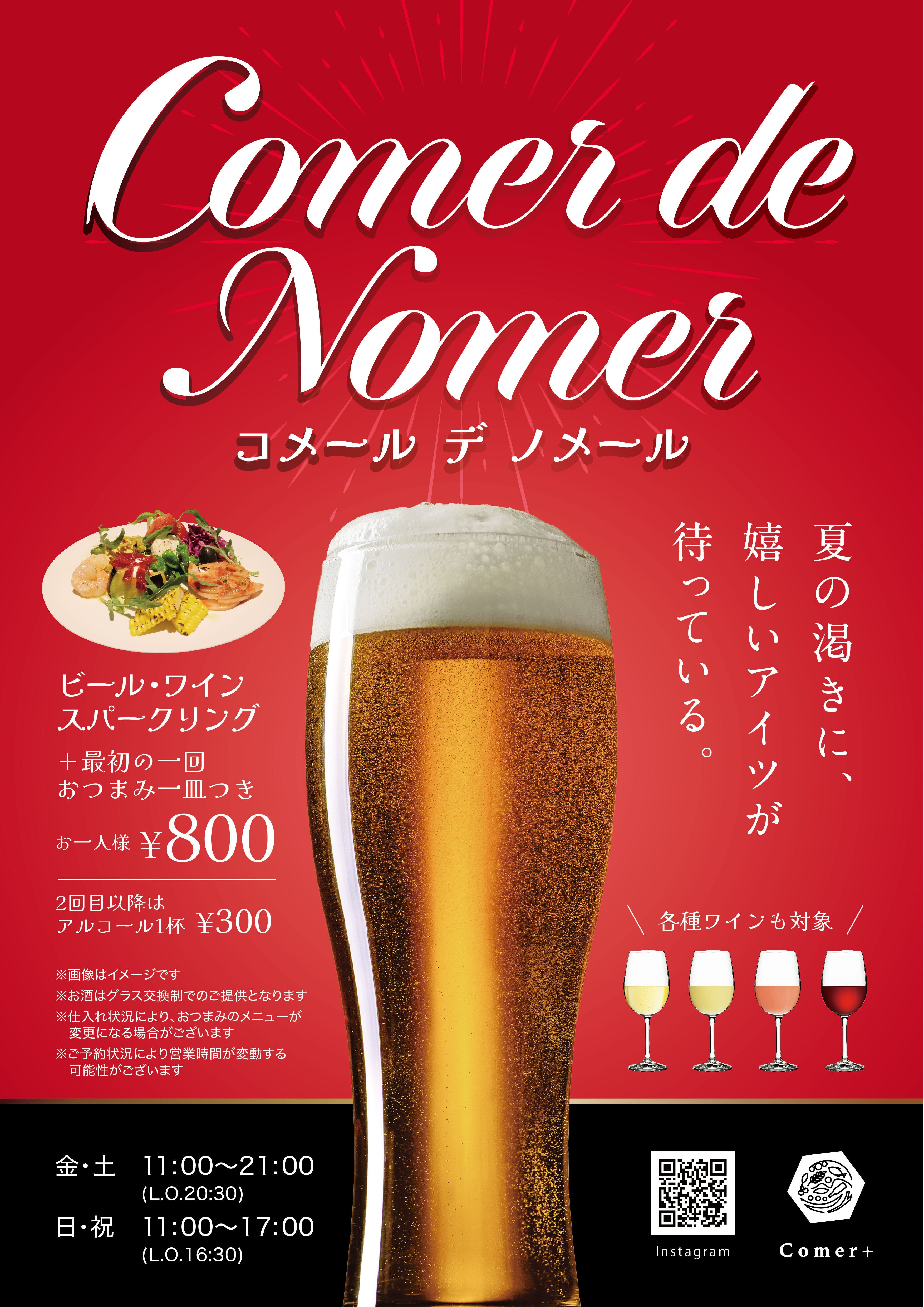 Comer+では、ピッツァのほか美味しい各種お惣菜も取り揃えており、様々なメニューから食事を楽しむことができます。また、シーズンごとにお得なサービスも展開。現在は、ビール・ワイン・スパークリングにおつまみ一皿を800円で楽しめる「コメール デ ノメール」を開催中!