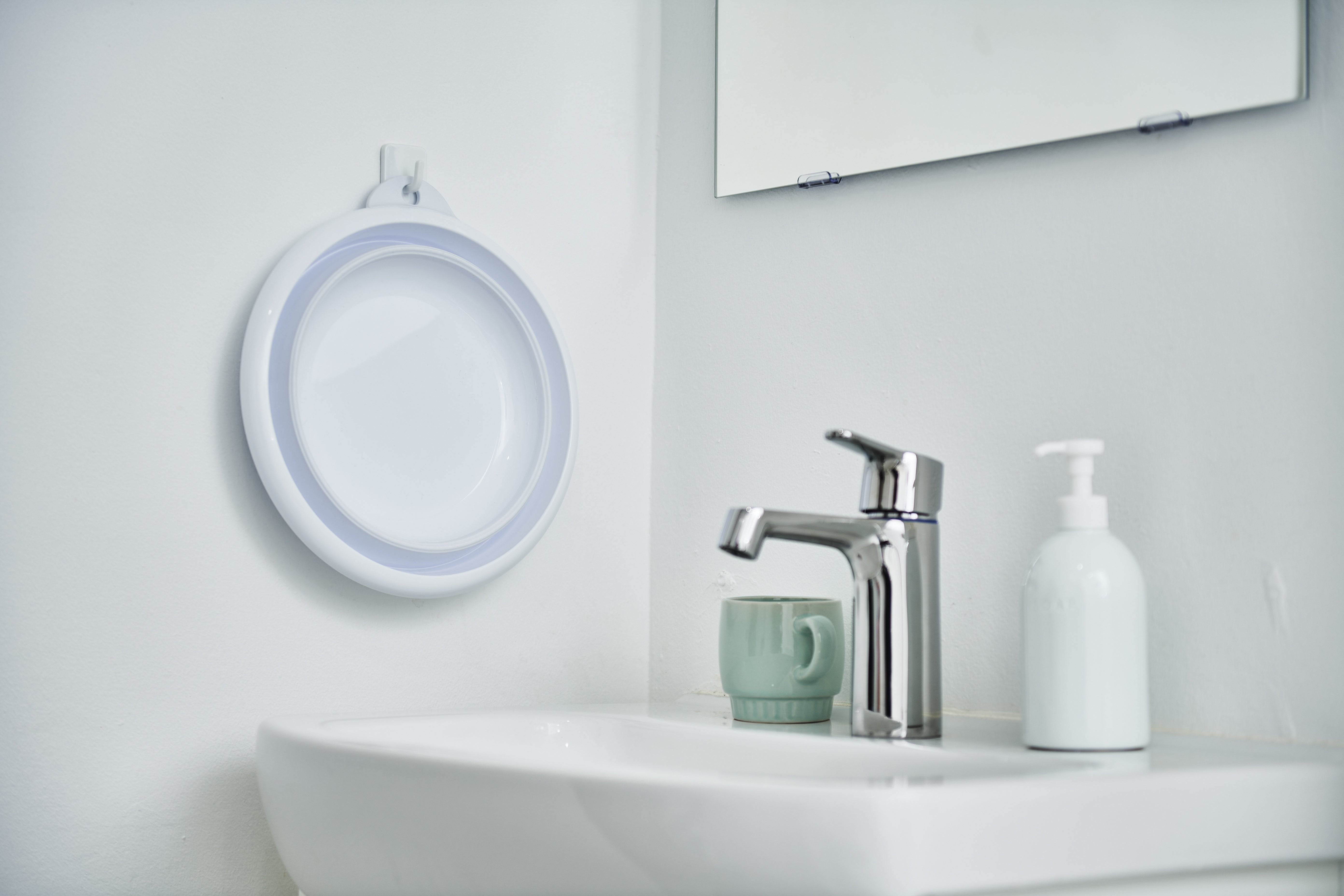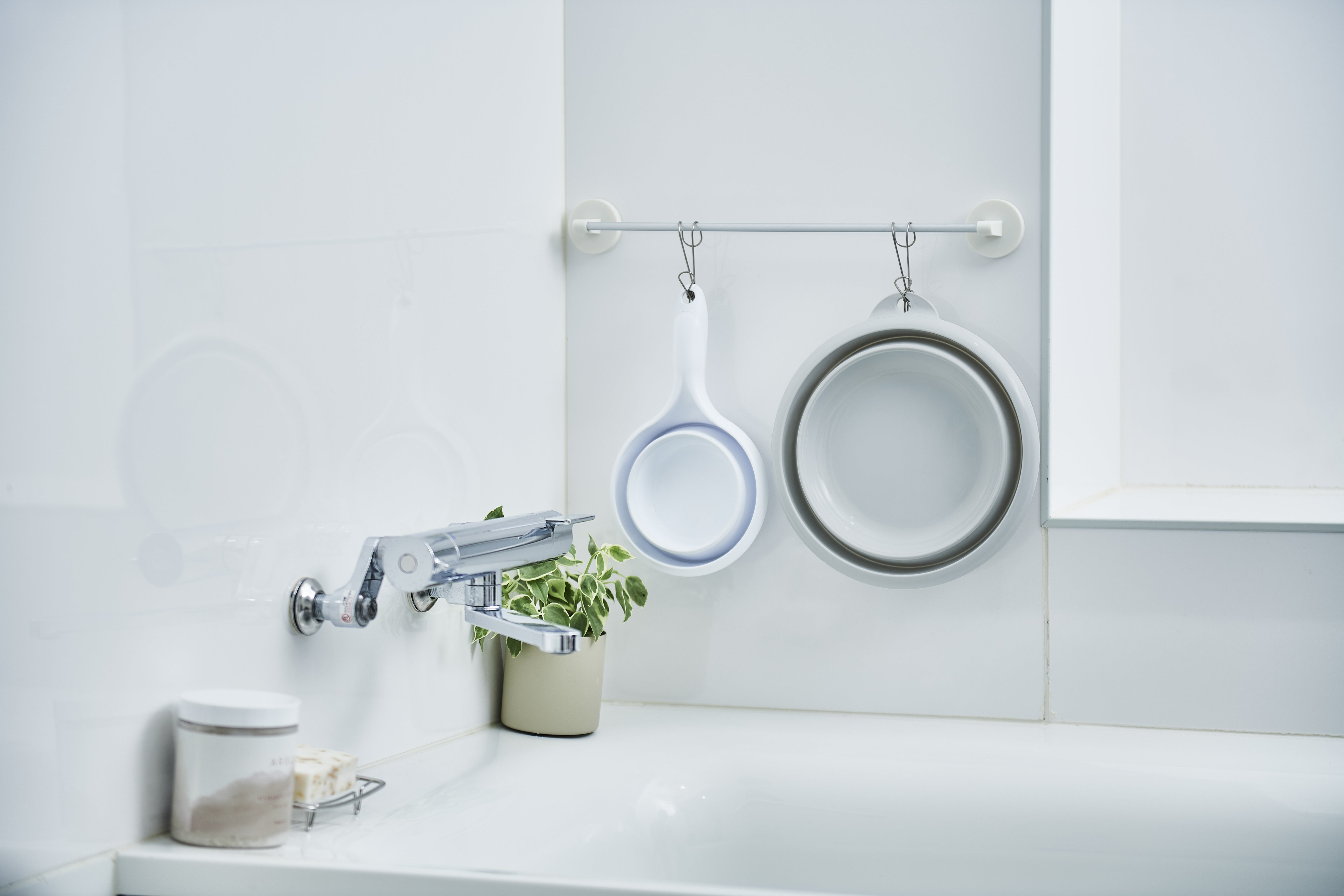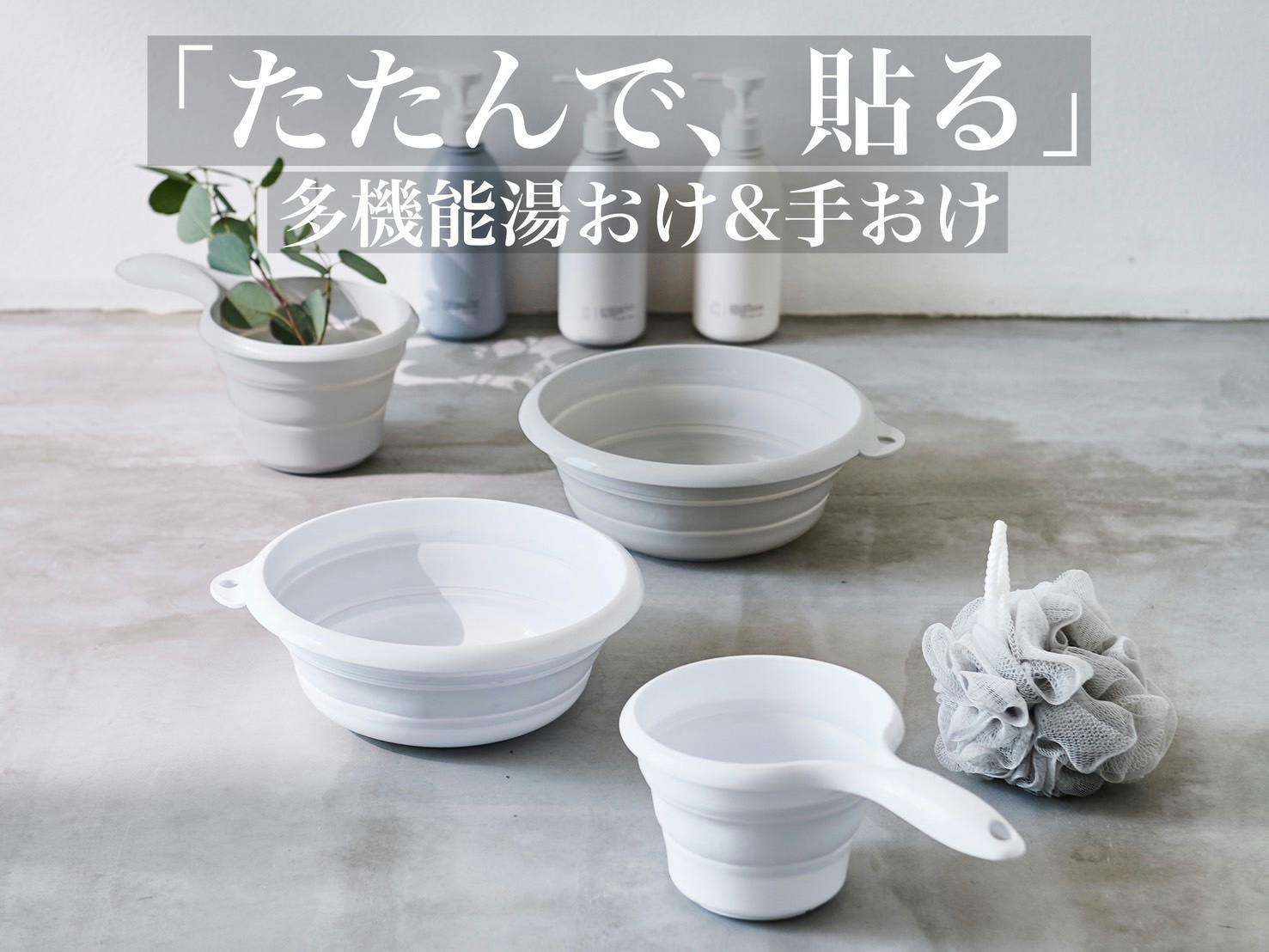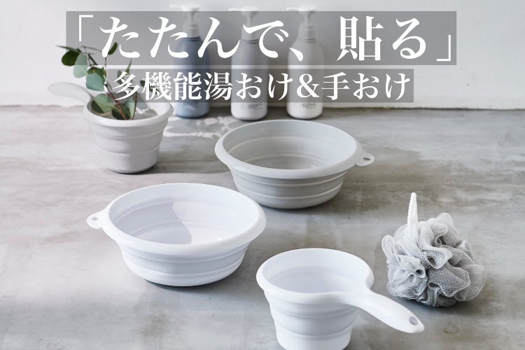 突然ですが、ほとんどの家庭の浴室にある湯おけや手おけ、皆さんどこに置いていますか?使用機会が多いが案外邪魔になることが多いですよね。「置くところに困る。」「広々とした浴室でゆっくり湯船に浸かりたい。」「狭いバスルームをスッキリしたい。」そんな声をもとに、この商品の開発が始まりました。