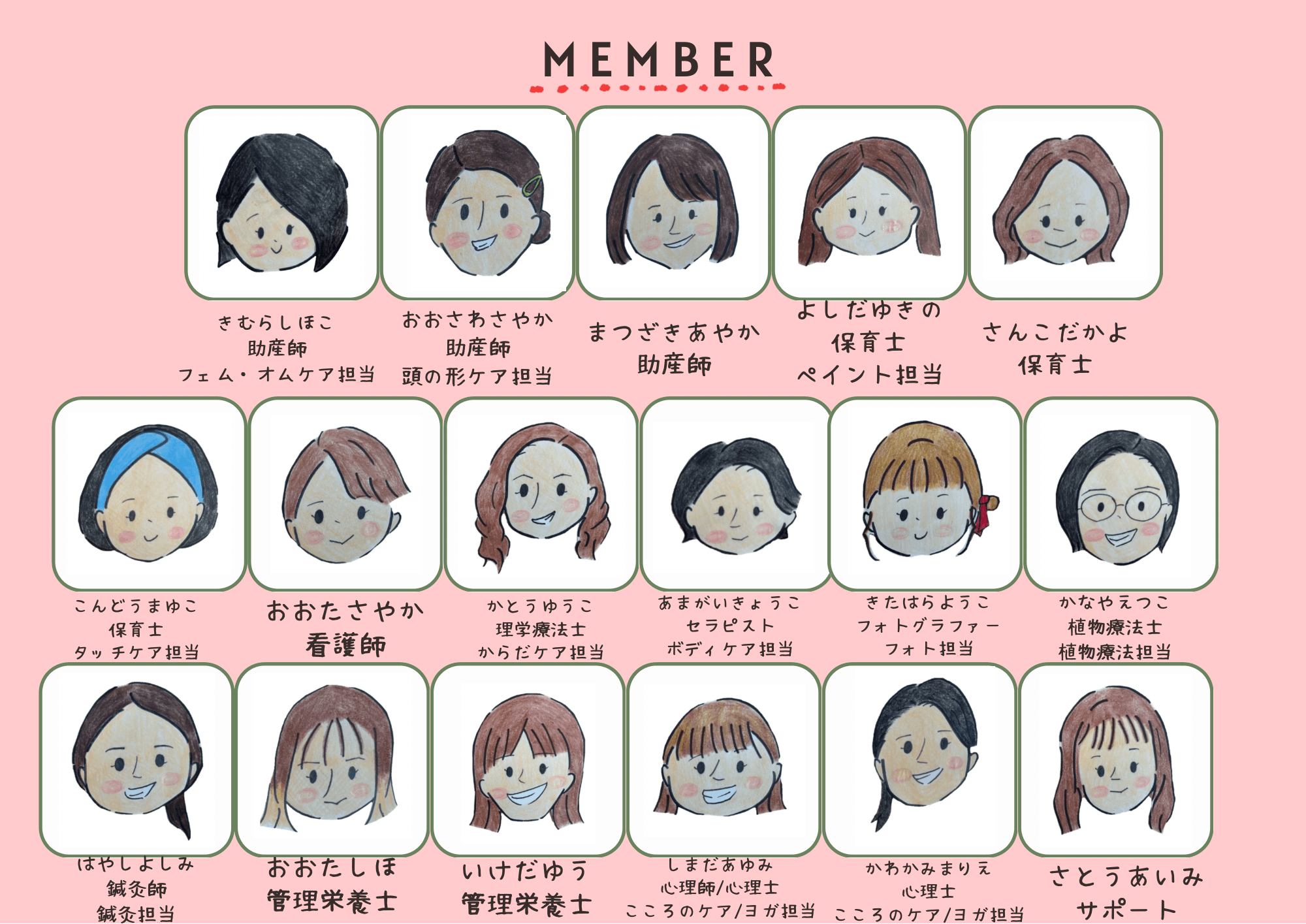 当院には様々な専門家が居るのが強みです!「助産師」「保育士」「看護師」「理学療法士」「管理栄養士」「鍼灸師」「臨床心理士/公認心理師」「植物療法士」「フォトグラファー」など、他にも沢山の魅力を持った仲間で構成されています。