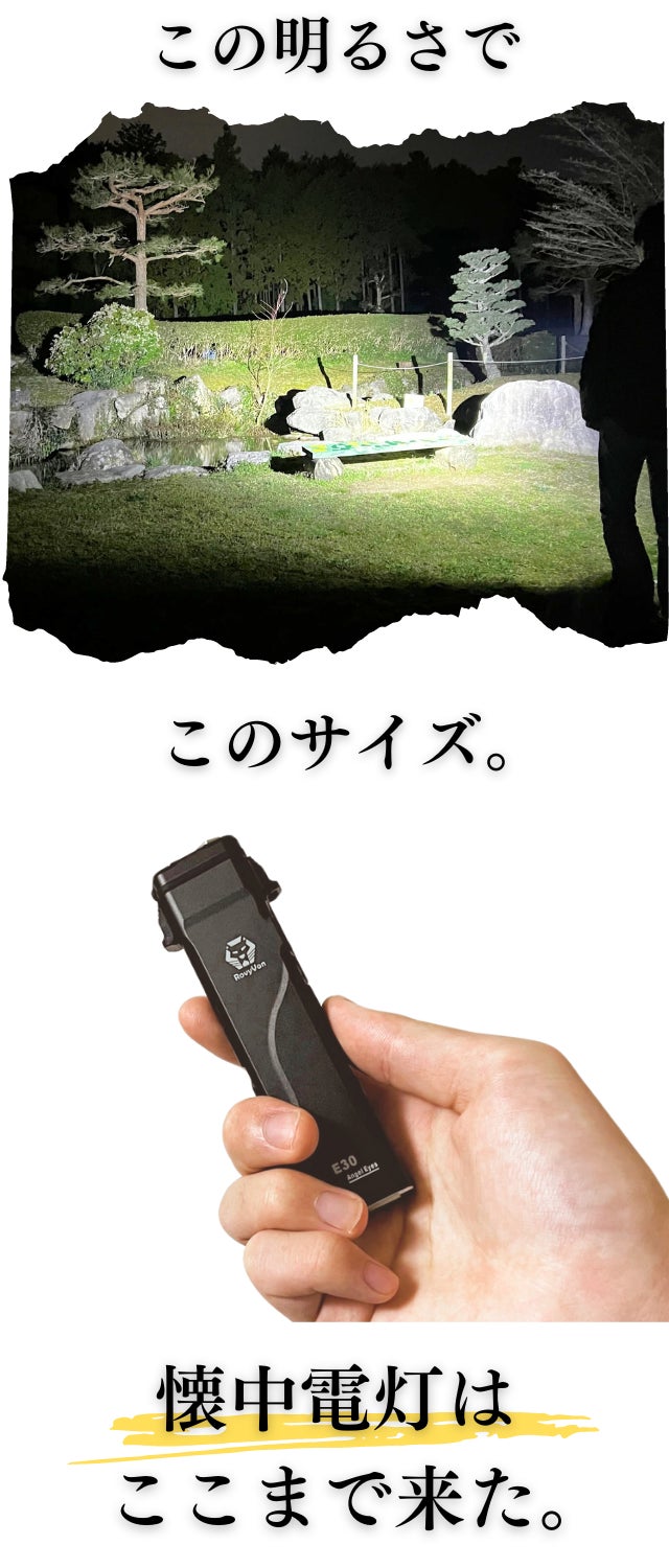 夜道も明るく照らす『E30』。乾電池との併用で電池切れの心配もないE30なら夜間の外出も安心です。