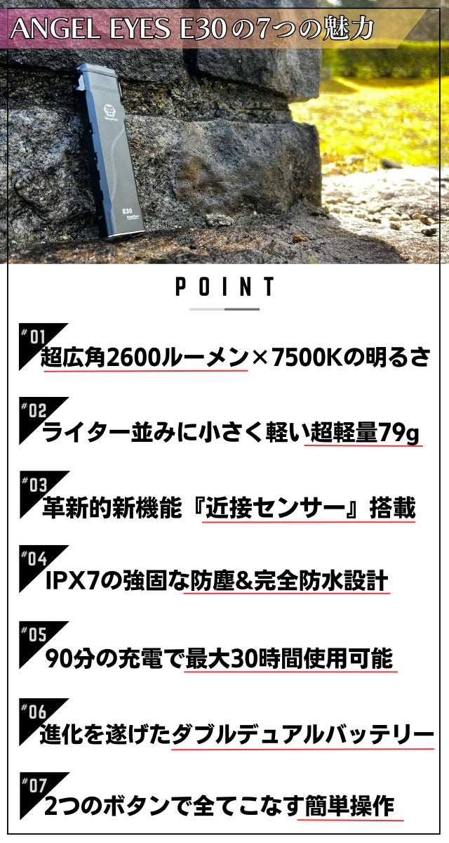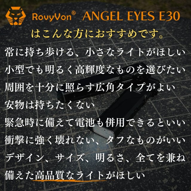 CAMPFIREにおいて、650万円以上の支援総額を記録した前回プロジェクト「ROVYVON E3Plus」。大きな人気を博したE3Plusの利便性はそのままに、その明るさ、機能性、デザインなど、ほぼすべてを大きく進化させた『ANGEL EYES E30』は、ROVYVONが誇る今最も新しく美しい小型LED懐中電灯です。