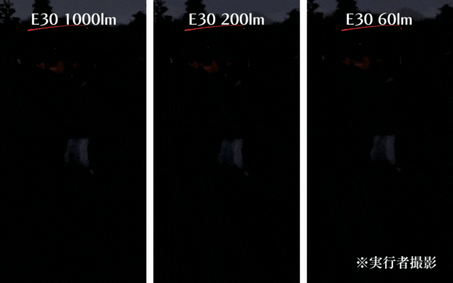 人が感じる明るさはルーメンだけでなく、光の広角性とのバランスで決まります。広域に光が届くE30は数字以上に視界が明るく感じられる点が魅力です。