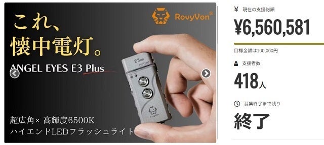 2024/09/02 11:59いつもありがとうございます。プロジェクト実行者のASTROSQUAREです!新機能搭載、太陽の如く照らすLED懐中電灯『ANGEL EYES E30』のプロジェクトも、おかげさまで土曜日に終了し、150名以上の方から230万円を超えるご支援をいただきました。サポーターの皆さま、応援誠にありがとうございます。E30の製造については、すでに部品調達を進めており、予定より早くすべてのサポーター様にお届けできるスケジュールで進んでおります。また詳細なスケジュールが分かり次第、こちらでご案内いたしますので、どうぞ楽しみにお待ちいただければと思います。【お届け先の変更について】なお、お届け先のご住所が変更となる場合は、事前にCAMPFIREの管理画面にてご変更ください。出荷準備が整いますとお届け先の変更ができないかたちとなりますので、お早めに対応をお願いできますと幸いです。今回のプロジェクト『ANGEL EYES E30』は、非常に注目度の高いプロジェクトとなりました。長さ12.1cm×幅2.9cm、厚さ1.5cmという小型サイズに最大2600ルーメンの高照度LED、単4電池が2本併用できるデュアルバッテリー、明るさを自動でコントロールする近接センサーにIPX7の完全防水仕様など、非常に高い性能を誇るハイエンドLED懐中電灯です。今回のE30につきまして多くの方にご支援いただきましたこと、改めて感謝申し上げますm(_ _)m皆さまに商品をお届けできる日まで気を引き締めてまいりますので、引き続き最後までどうぞよろしくお願いいたします。 もっと見る