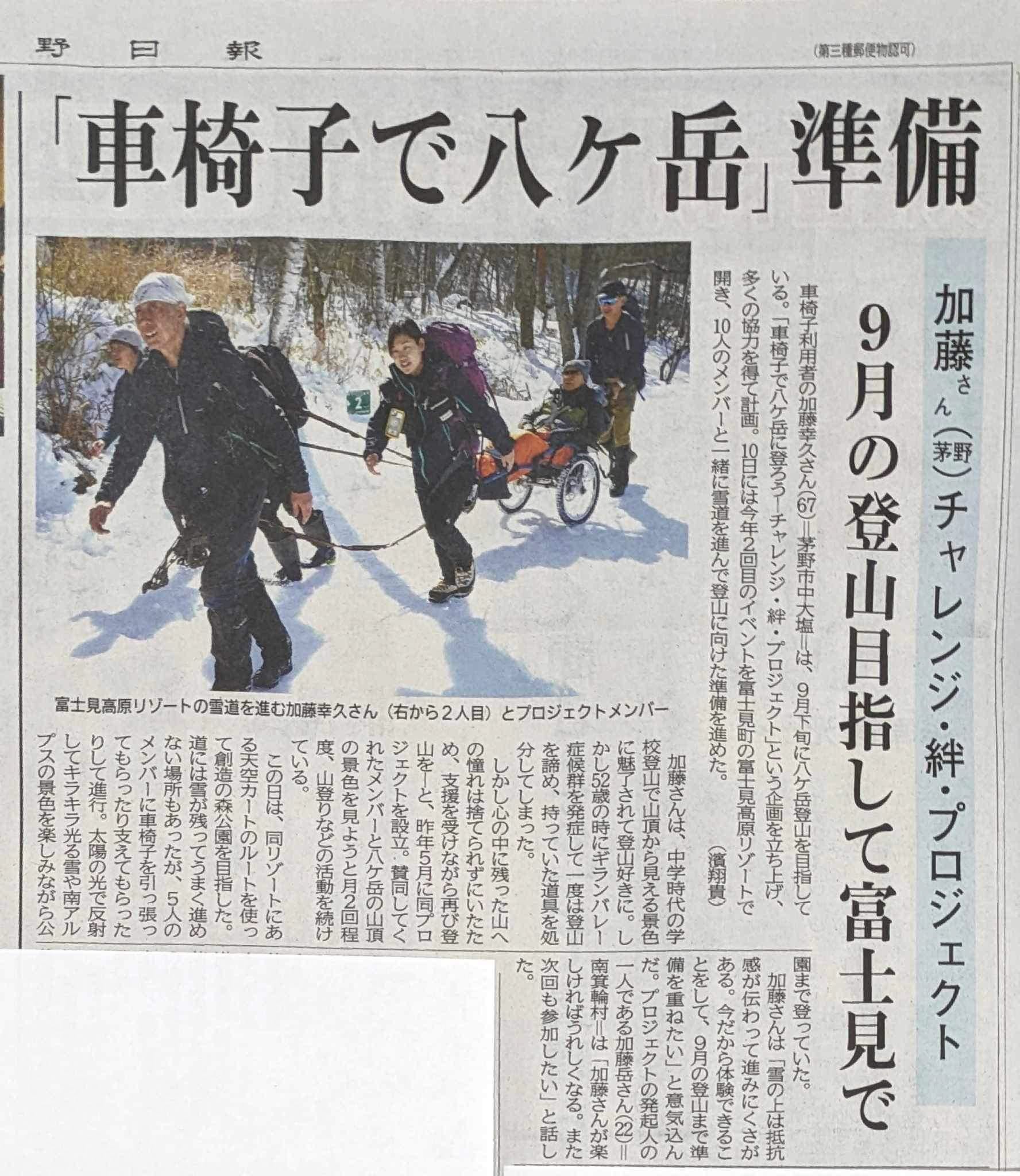 八ヶ岳開山70年の歴史で初めてとなる、車椅子ユーザーの八ヶ岳登頂の挑戦を多くの皆様に知ってもらい、たくさんの応援を頂きたいと思っています。 そして、そのエールを力に変えて、かけがえのない仲間たちと共に登頂を目指します。