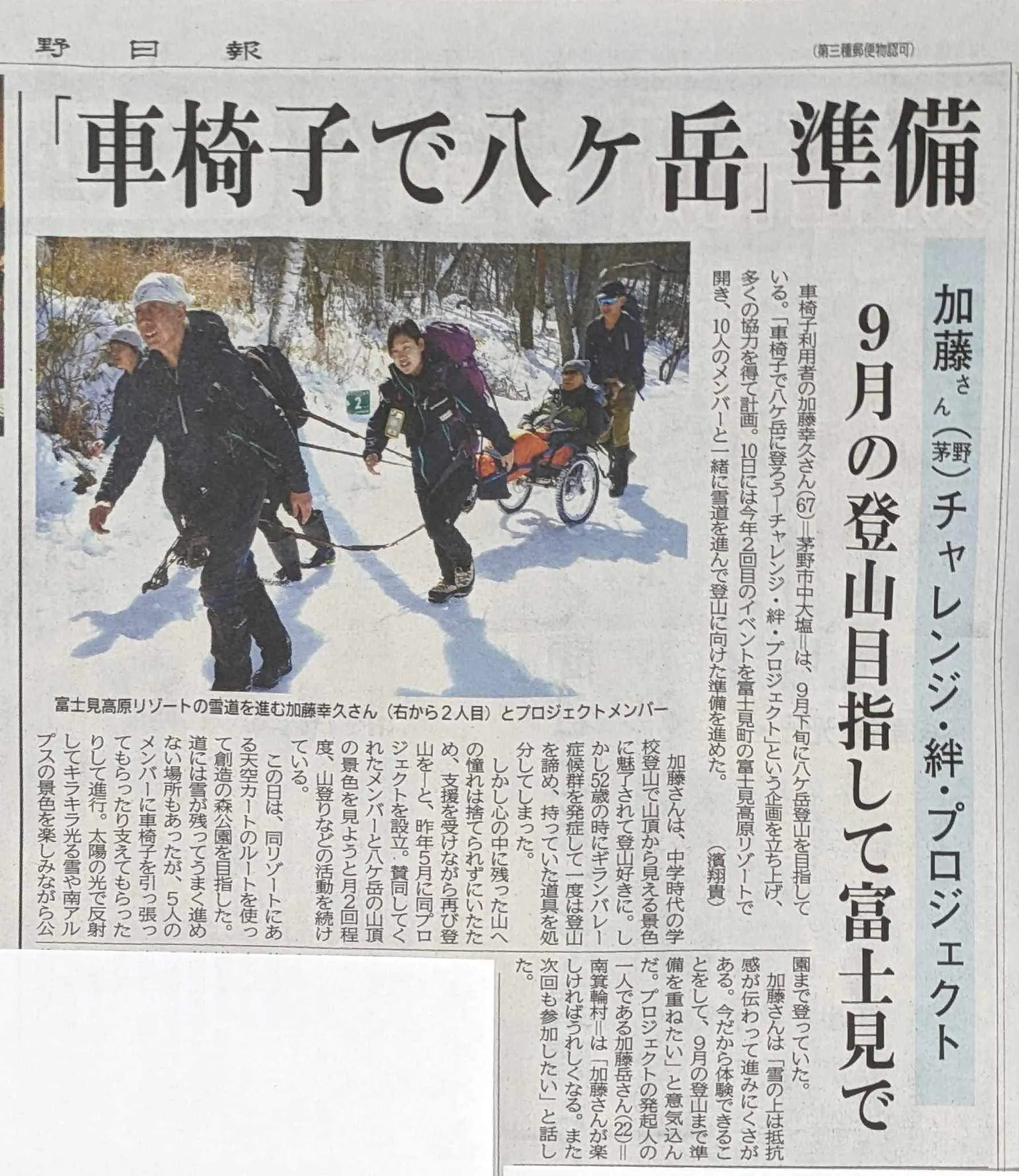 私は、このプロジェクトのキャプテンとして「車椅子で八ヶ岳に登る」という自分の夢を仲間たちの夢として、素敵な仲間と共に必ず実現させます。