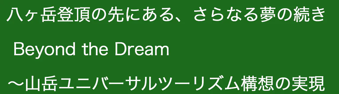 私は長年の夢である、「車椅子で八ヶ岳に登る」という人生最大の挑戦を通じて、まず自分の大切な夢をカタチにしたいと思っています。そして、その八ヶ岳登頂の経験を活かして障がいのある方々にも、山の自然を楽しめる登山体験の機会を “山岳ユニバーサルツーリズム” として実現させたいと考えています。